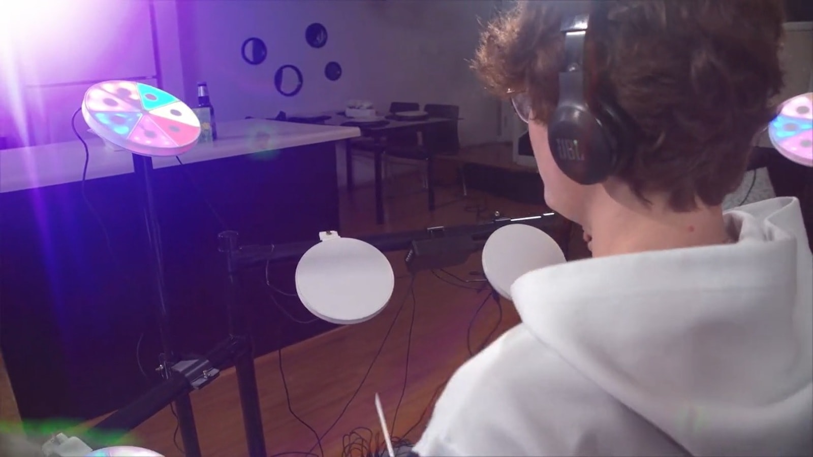 Designed with UI screens as its drumheads, it responds when you tap on the multicolored sections on the screens.