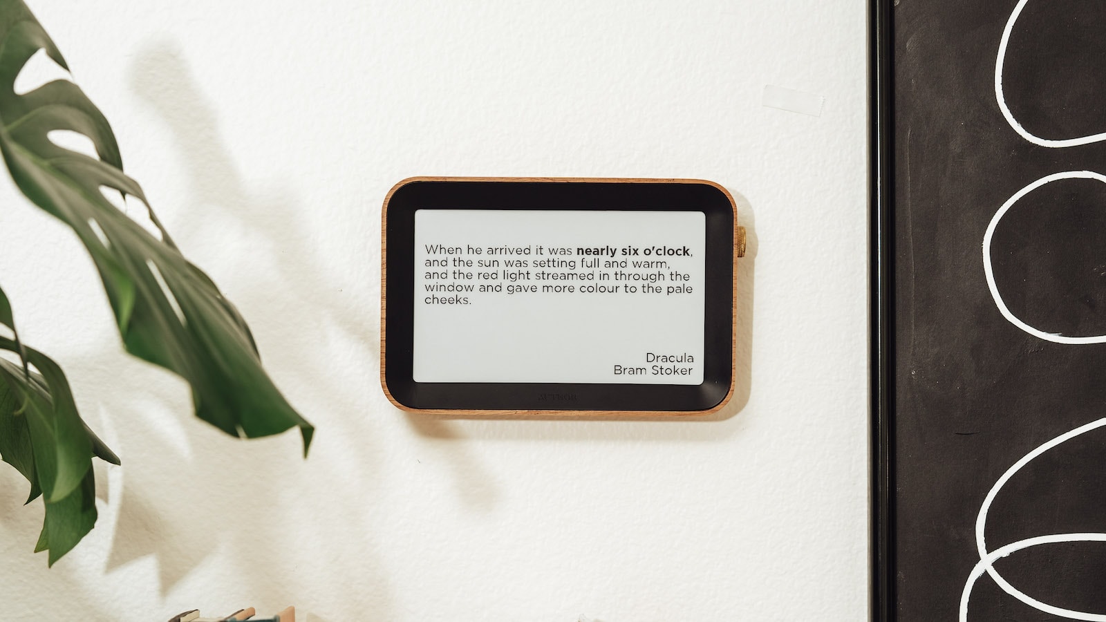 Available in small 4″ and large 7.5″ sizes, the small has a desktop stand and a three-week-long battery life. The large size can stand on your desk or mount on a wall, and it has a 2-month battery life.