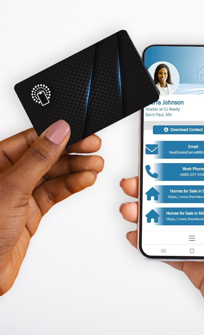 It has NFC technology in it, allowing it to wirelessly share a link to the digital business card with virtually any modern smartphone.