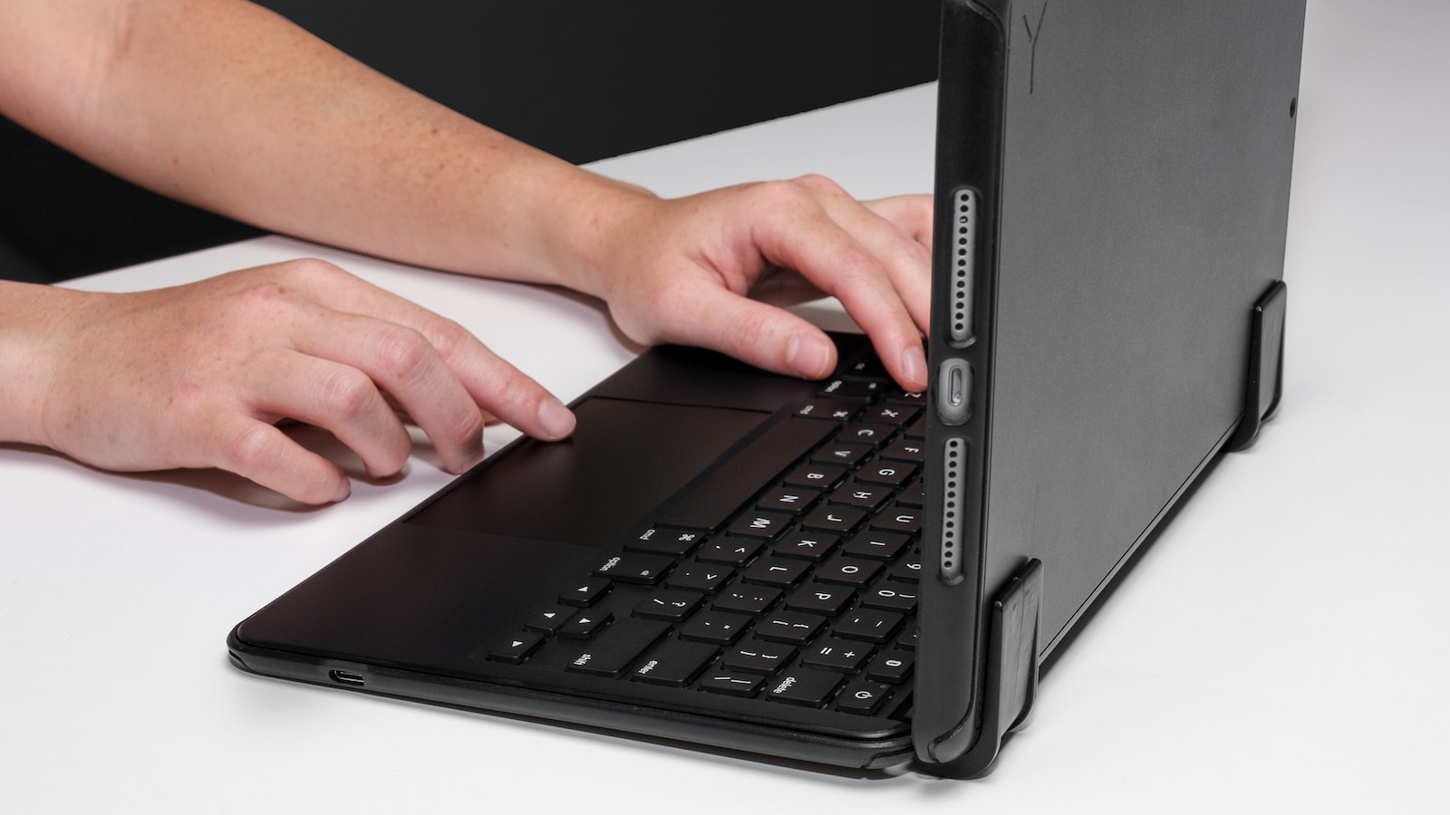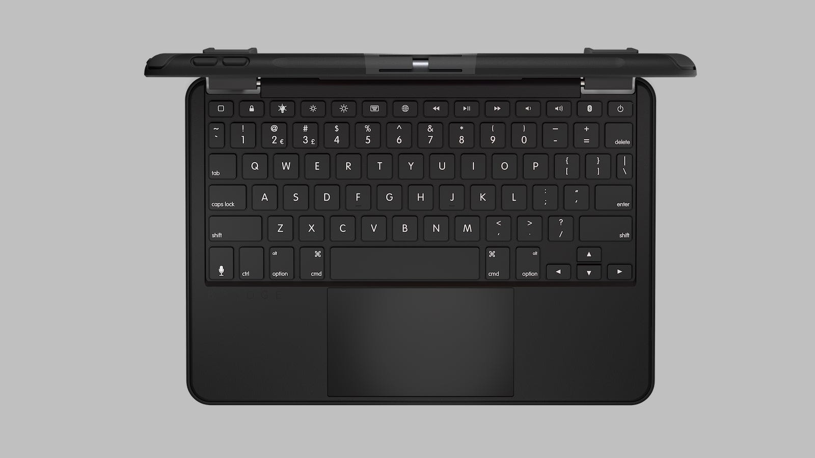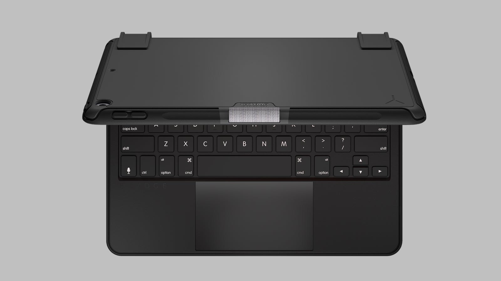 Offering up to 6 months of battery life, this antimicrobial Brydge keyboard case uses magnetic SnapFit clamps on the hinge.