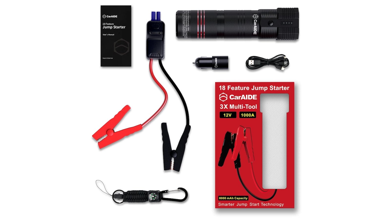 Drive your car often? You need the CarAIDE 3X vehicle multitool. This impressive gadget actually incorporates 18 tools in one compact device. It’s a powerful jump starter with 12 volts—or 1,000 amps—peak current. This means it can jump-start vehicles with up to a 6.0 L gas or 4.0 L diesel engine.