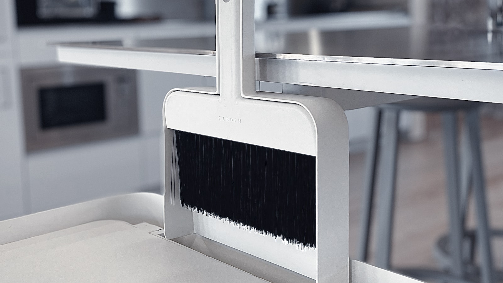 – Integrated dustpan and broom: The compact dustpan and broom slide in behind the bins. Simply access them with the push-to-release mechanism.