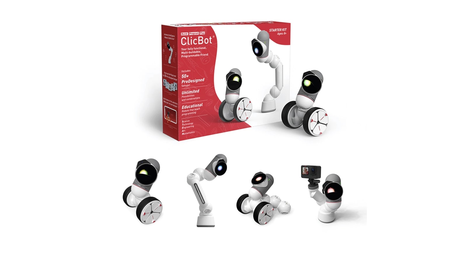 The ClicBot also sports a modular design with a brain, joint, wheel, skeleton, foot, holder, sensor, suction cup, and grasper.