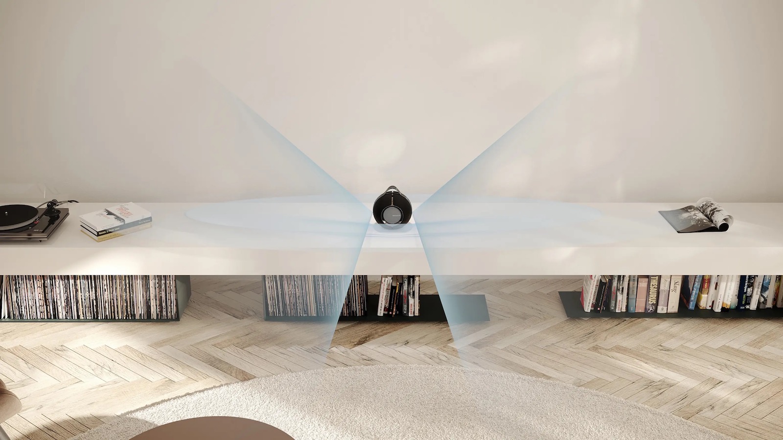 – Adaptive Soundstage: The speaker intelligently morphs its soundstage to match the physical environment, ensuring optimal audio performance.