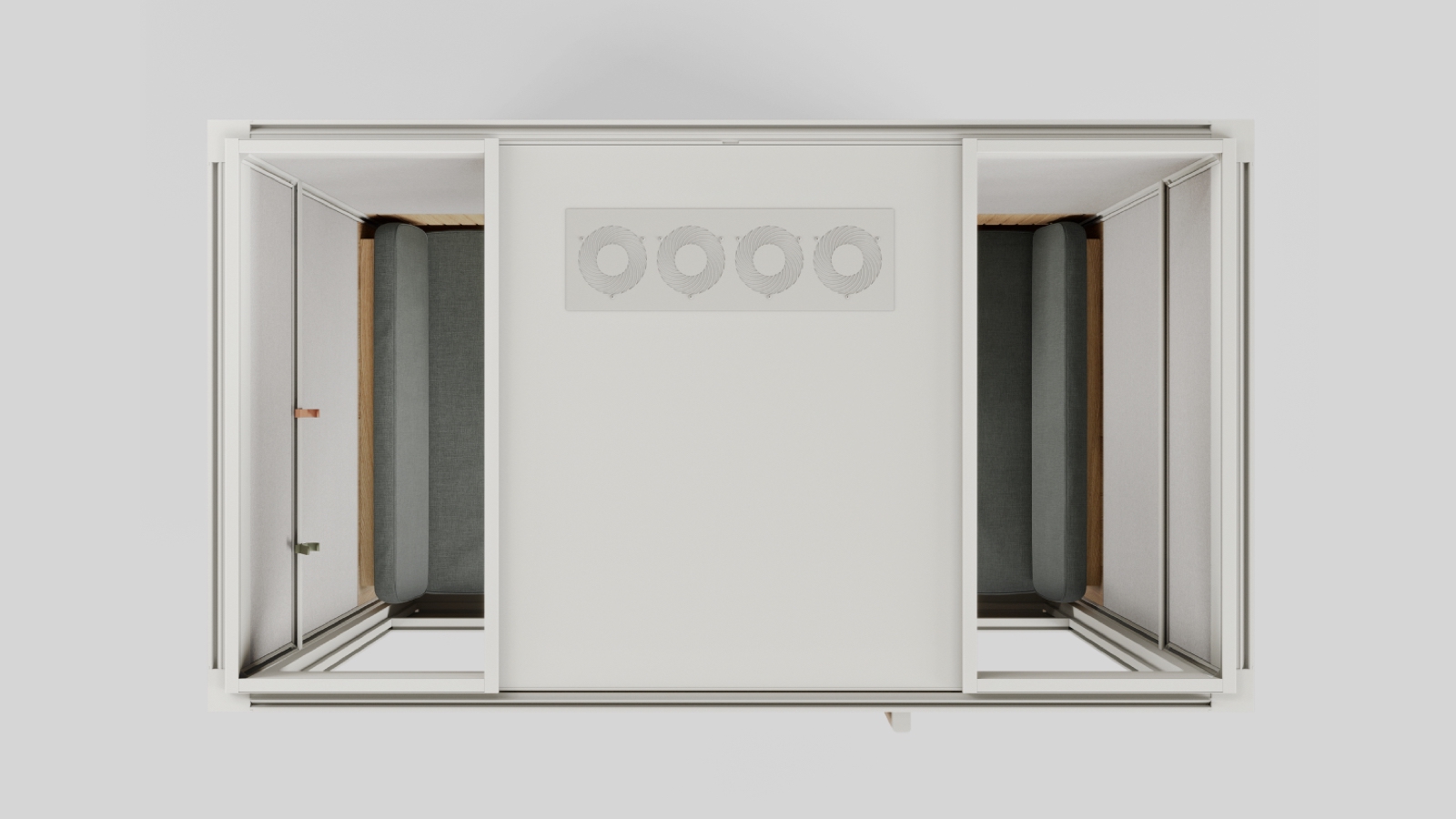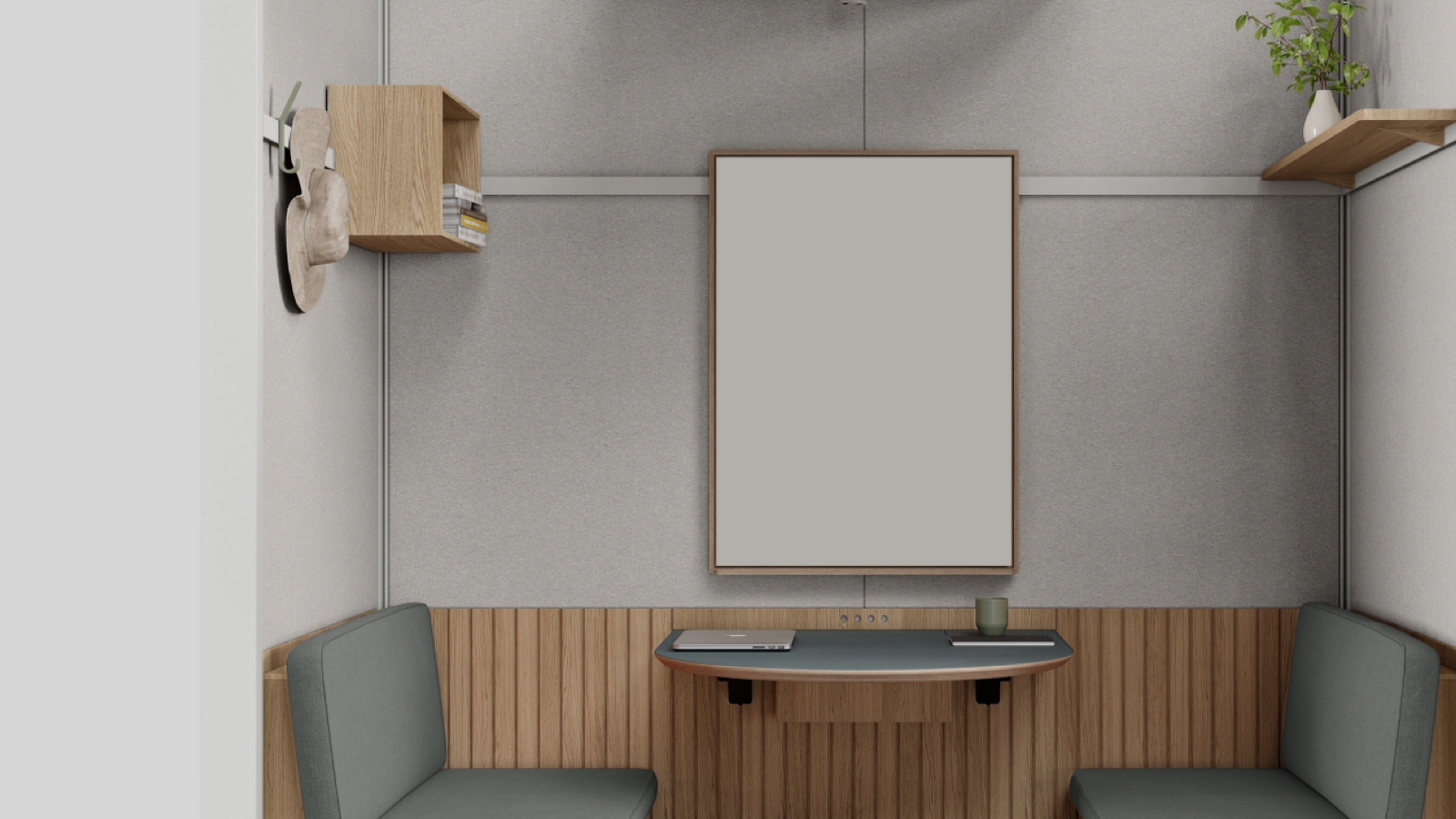 This includes power outlets for charging, an Ethernet cable, an HDMI port, and a camera connection port. It’s even equipped with built-in lighting settings. This allows you to create a suitable atmosphere for working or opt for a relaxing space. Additionally, the custom rails are great for hooks and shelves. Overall, you can tailor this meeting pod to your work style and needs