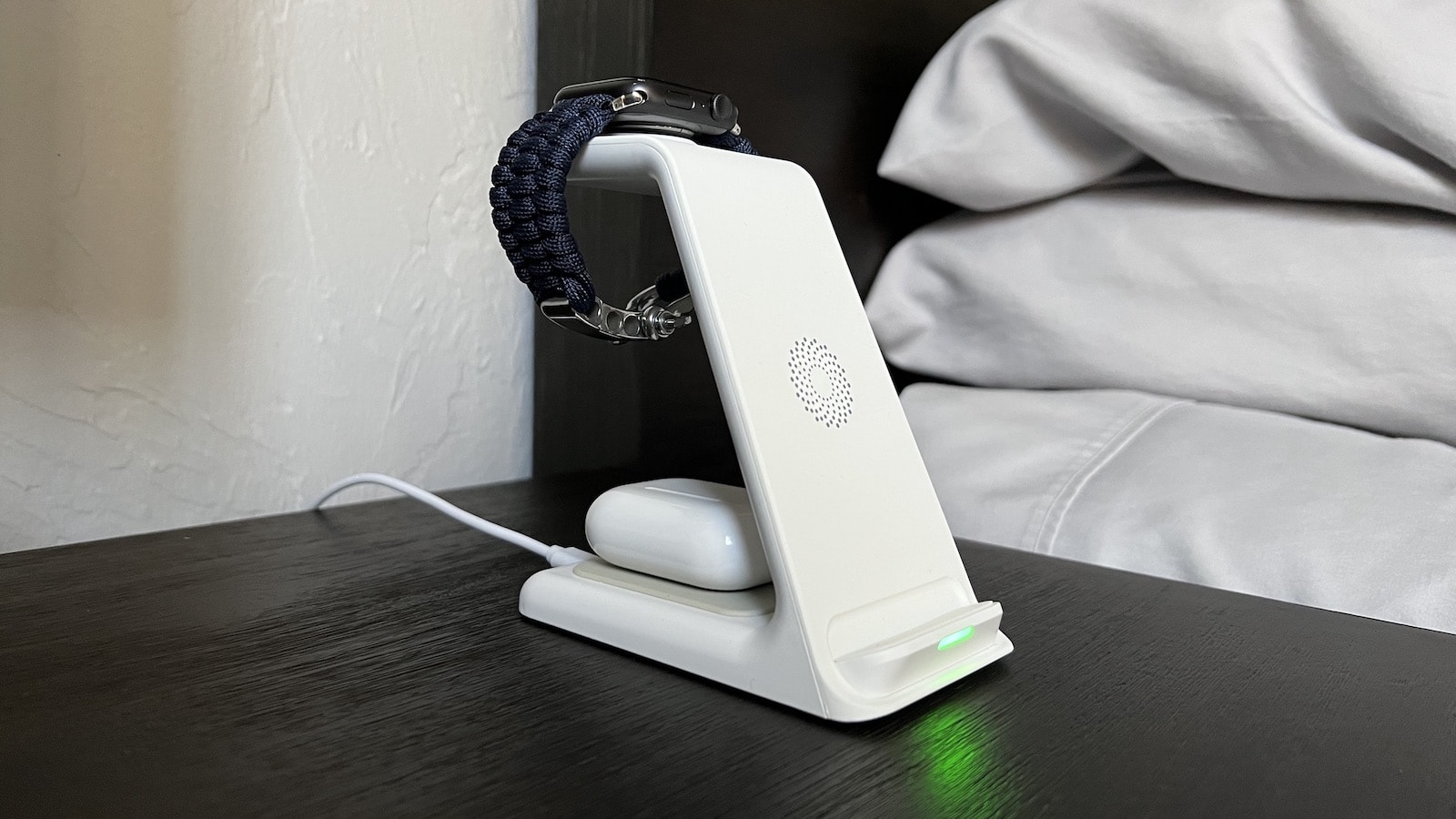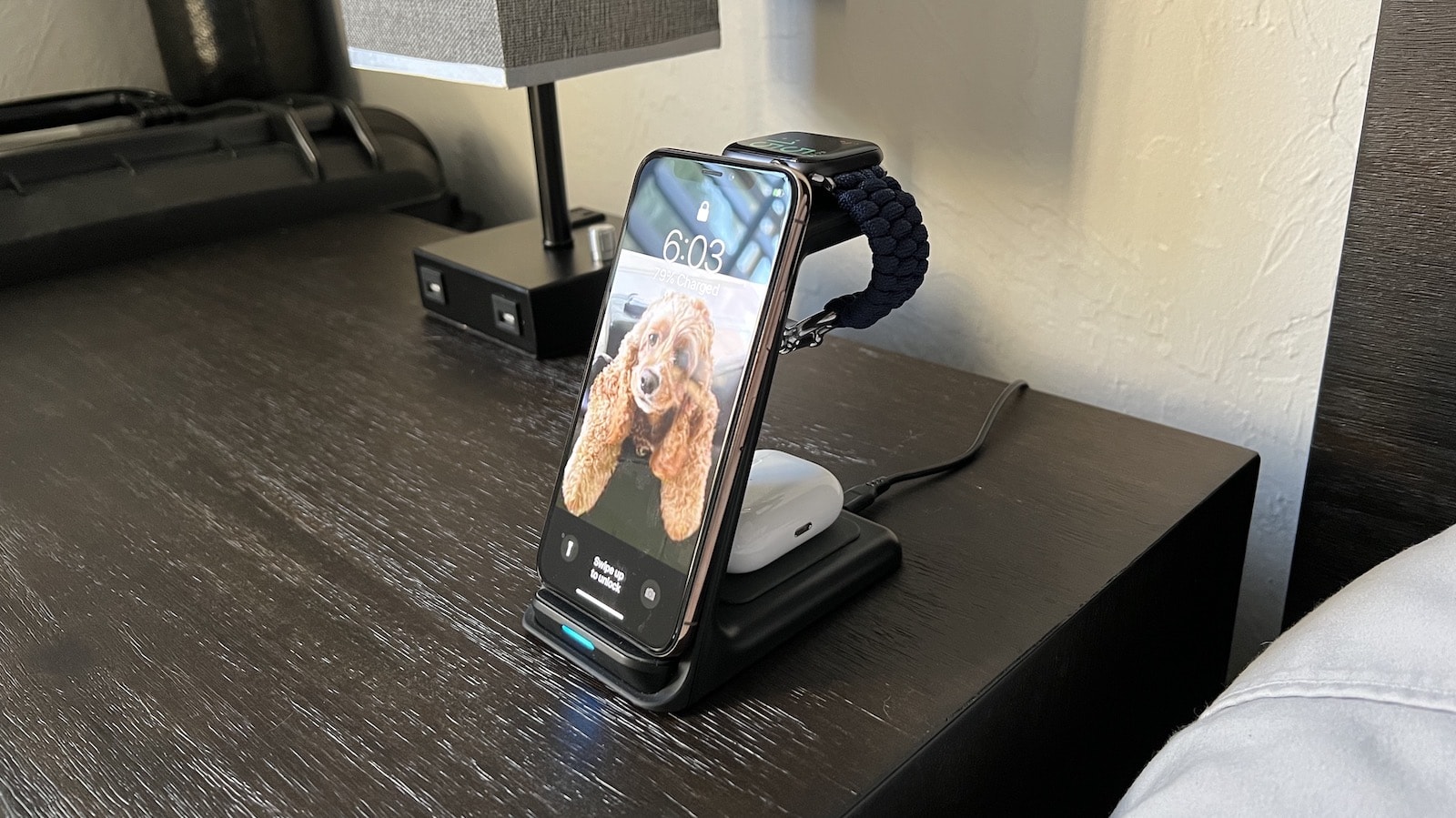 It delivers 15 watts of power to your phone while simultaneously charging your Apple Watch and AirPods.