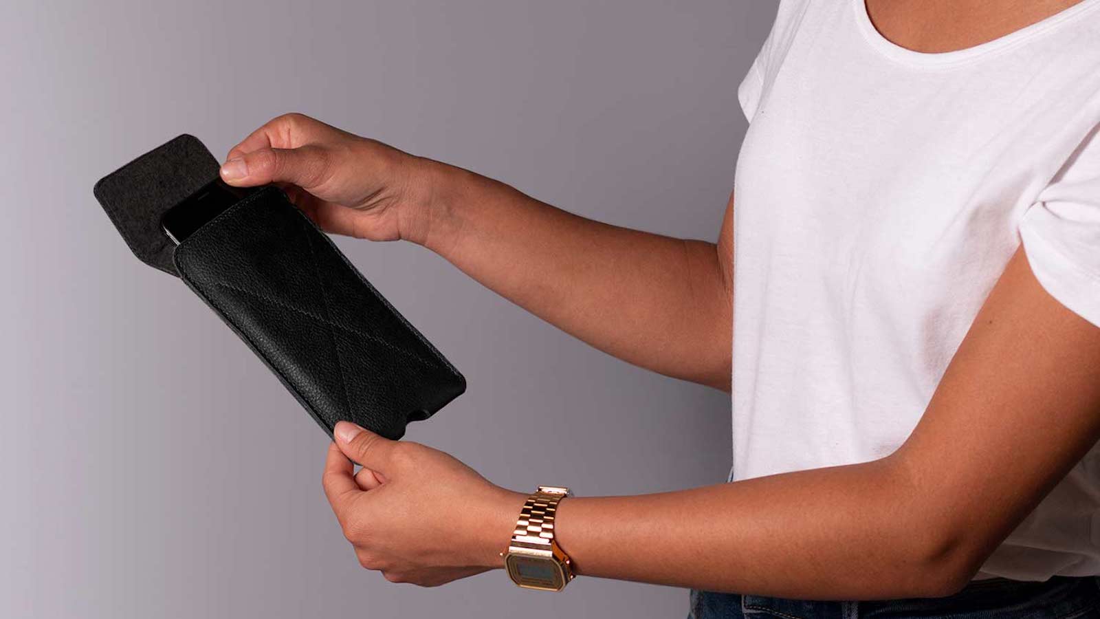 This material also forms a unique patina over time while the internal wool felt protects your phone screen.