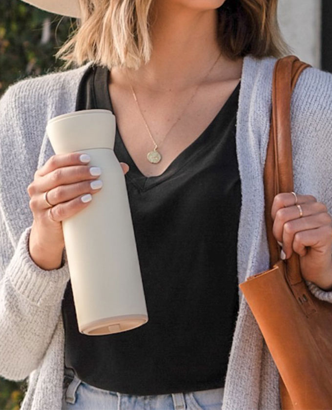The Hitch Water Bottle with Hidden Reusable Cup is a full-size, insulated water bottle. And it carries an insulated, reusable cup plus a lid for the mug. It’s a pain to carry around a bottle and a reusable cup, and Hitch solves that problem.