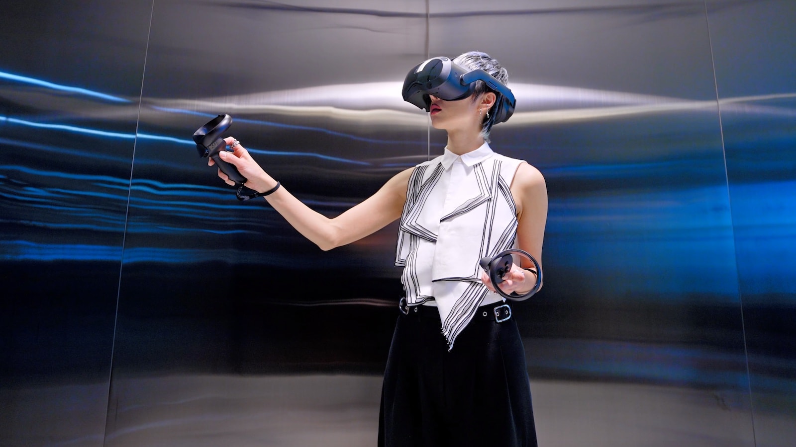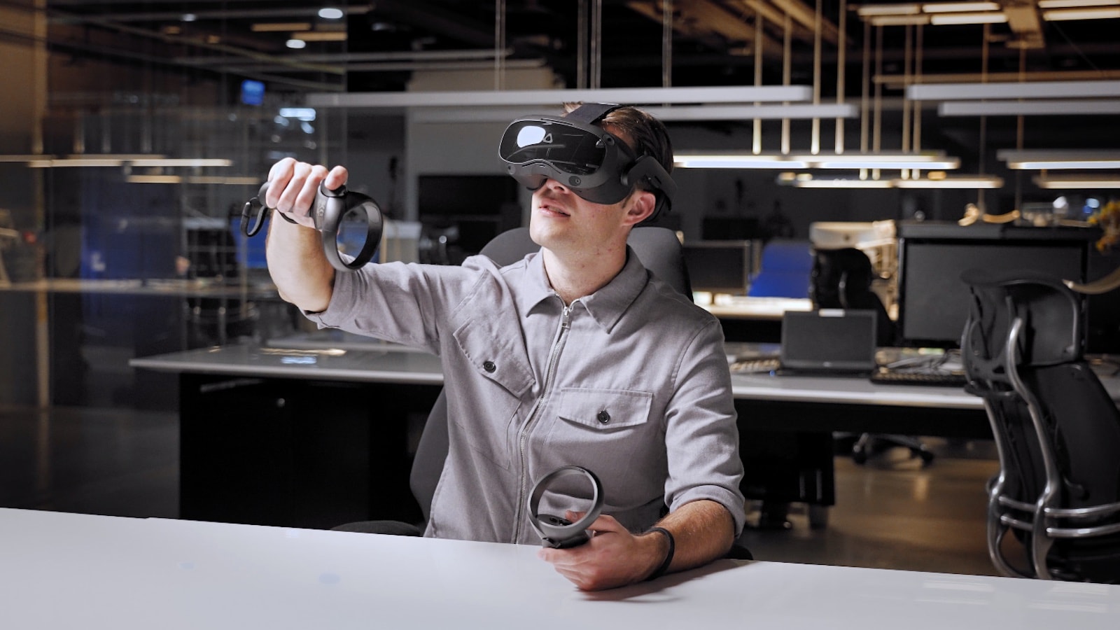 Designed for business use, the HTC Vive Focus 3 VR headset has a swappable battery design that mounts on the back.
