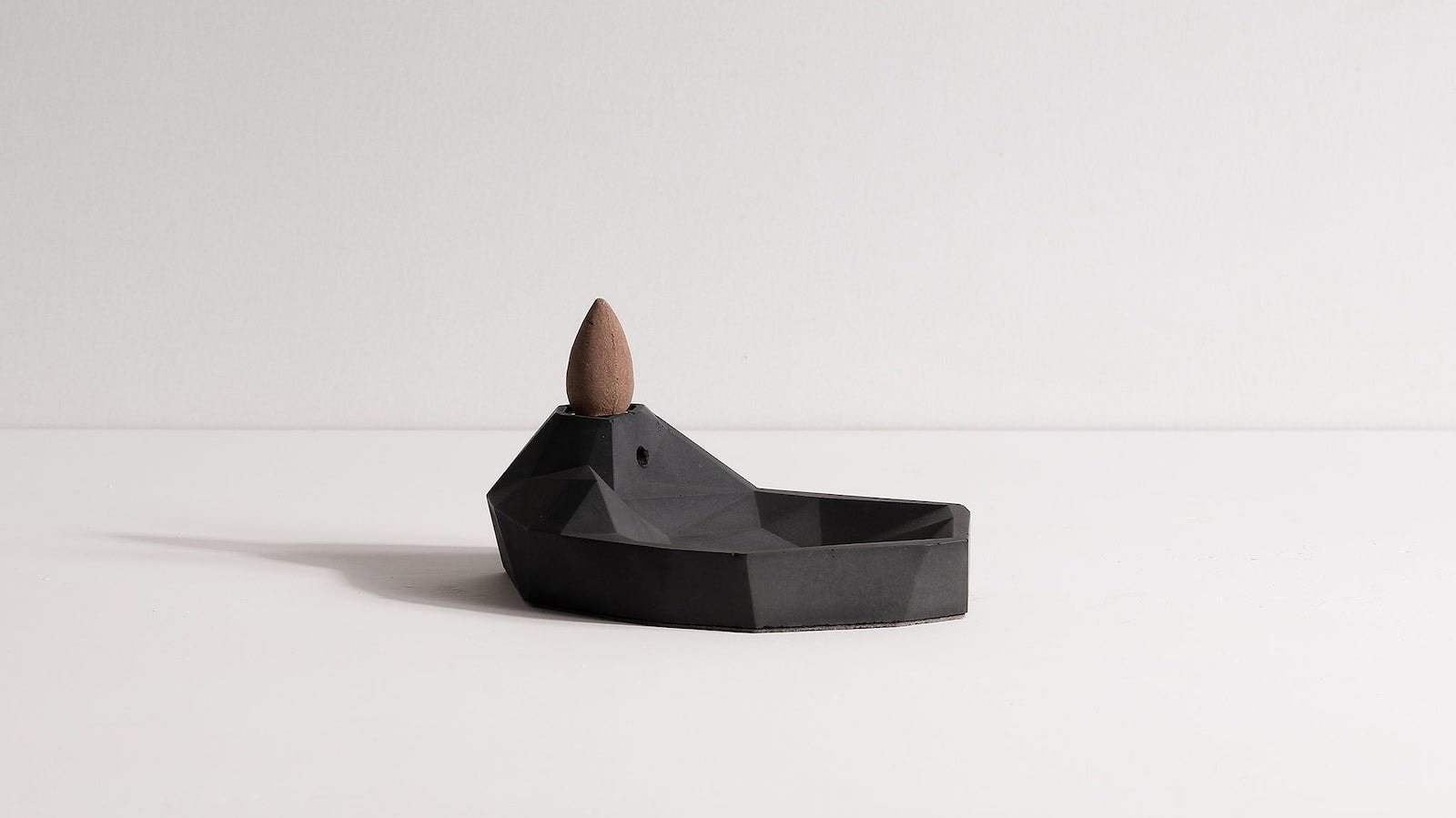 With that inspiration, it has a spot for a cone-shaped backflow incense to sit. It looks as if it’s on top of a mountain. This then directs the incense plume gently downwards into the basin. In fact, it looks as if the incense plume forms a lake of smoke.
