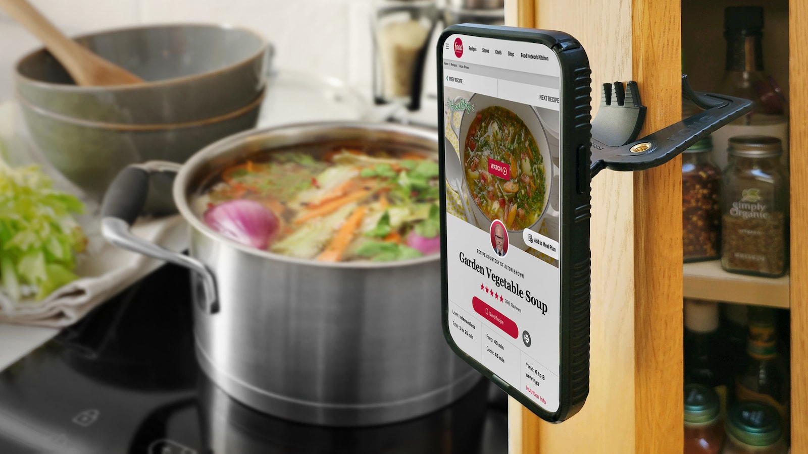 This jaw grip is also called a GRABSTAND, and it can grip branches, doors, cabinets, and more! That means you can clip it to a cabinet door while you cook for easy recipe viewing.