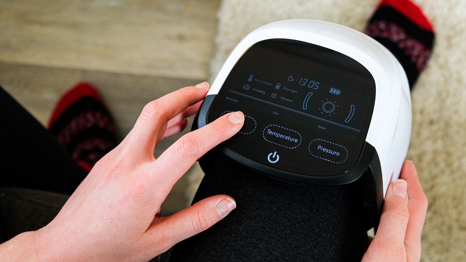 Ease pain and improve circulation with the Kneeflow Massager. This lightweight, portable knee relief device combines heat, massage, and red light therapy!