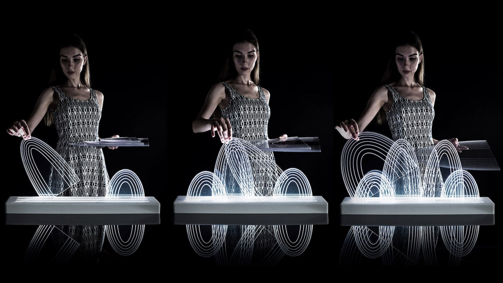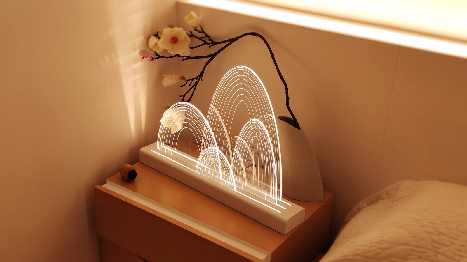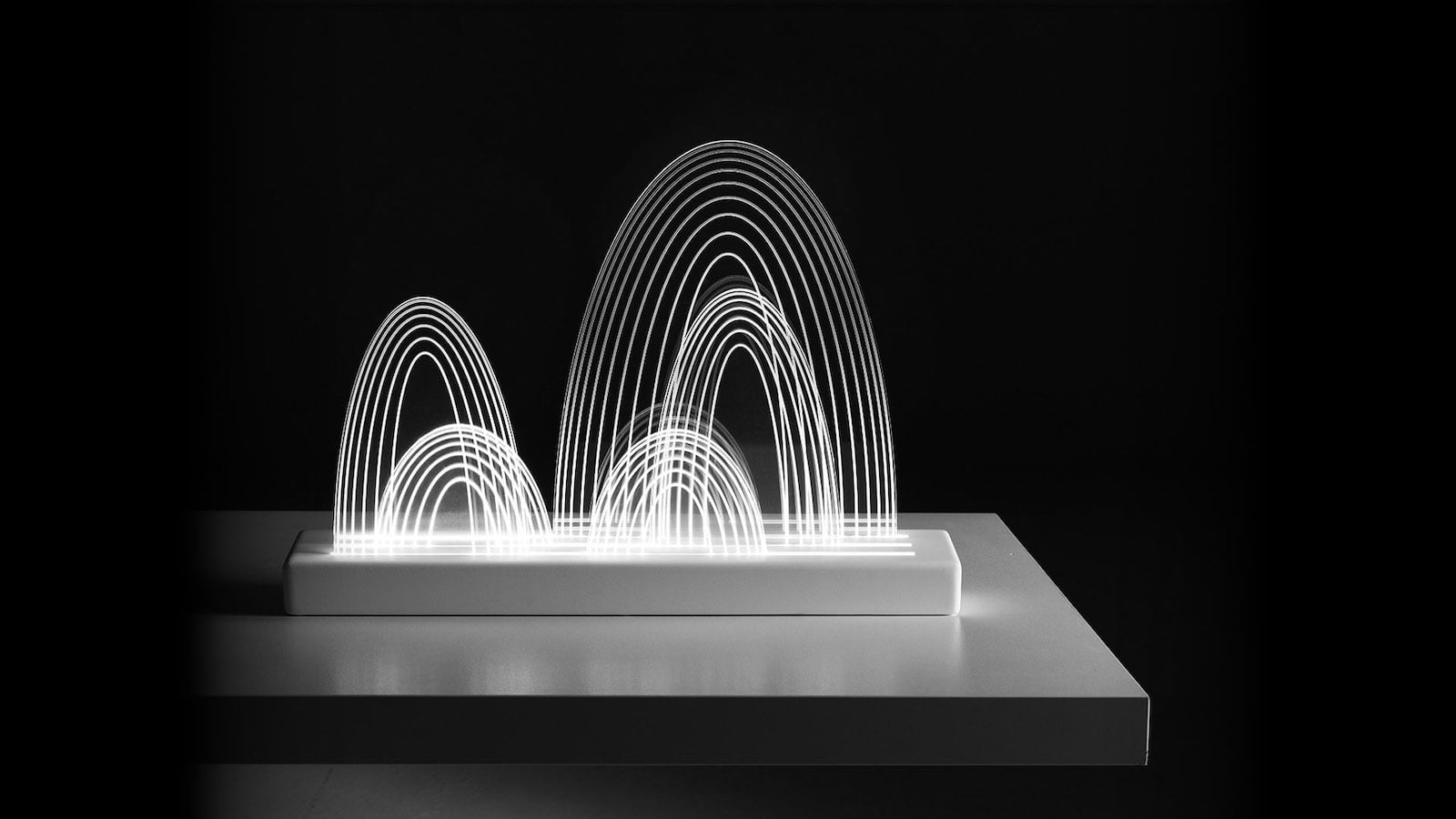 The light shines through the base and the clear mountains, bouncing off the lines etched into the acrylic.