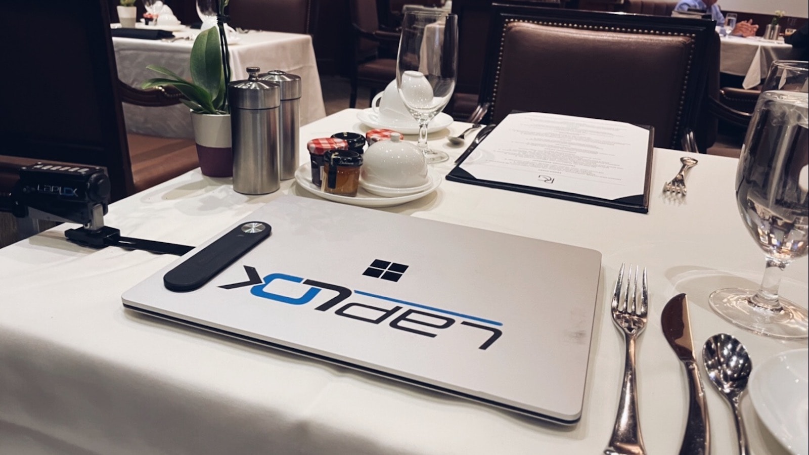 This Bluetooth-connected device has a patented design that connects to the underside of your laptop and then clamps to a tabletop or desktop.