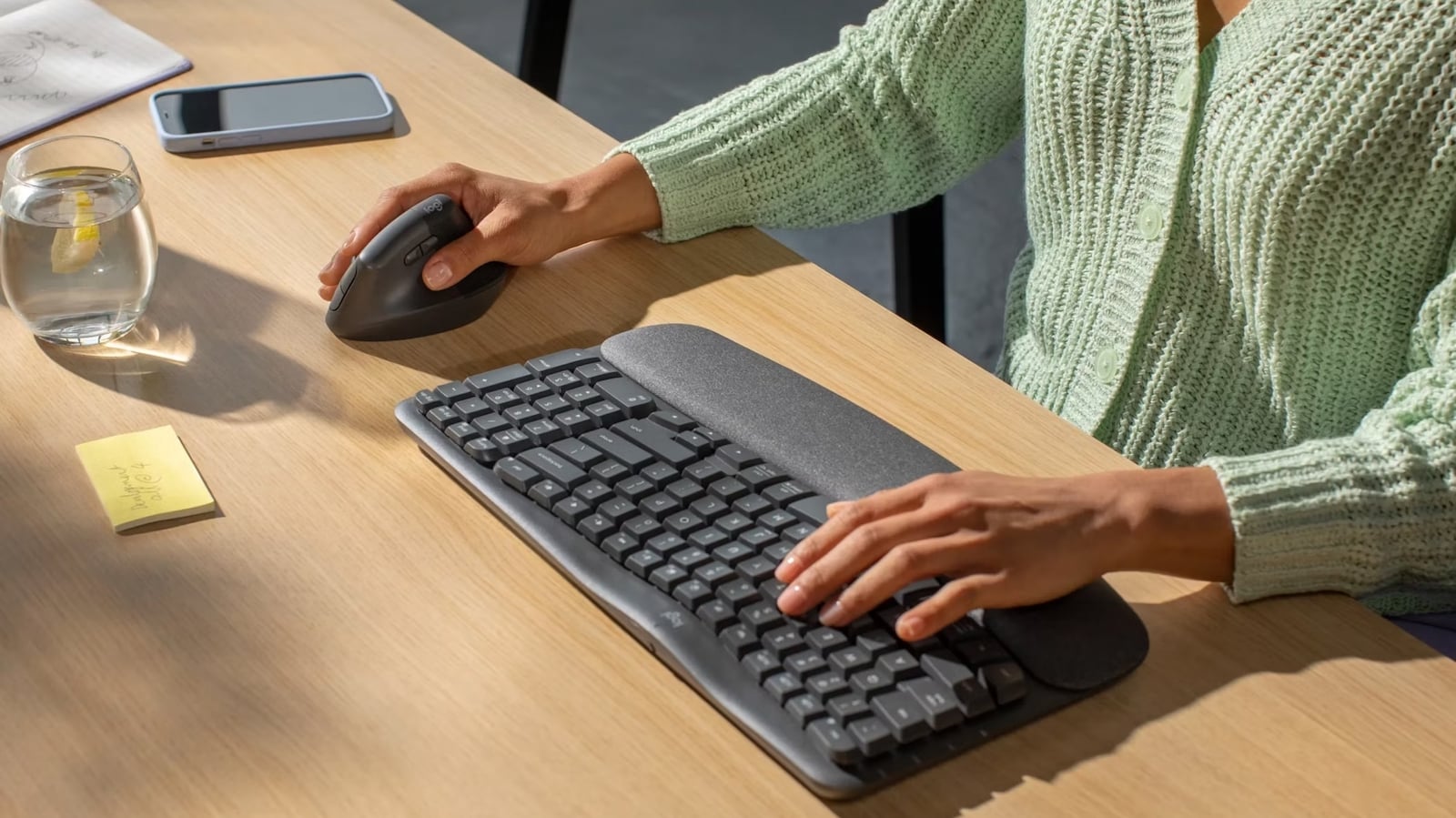 – Comfier typing: Thanks to its wavy design, this workspace keyboard keeps your hands and forearms in a more natural typing position.