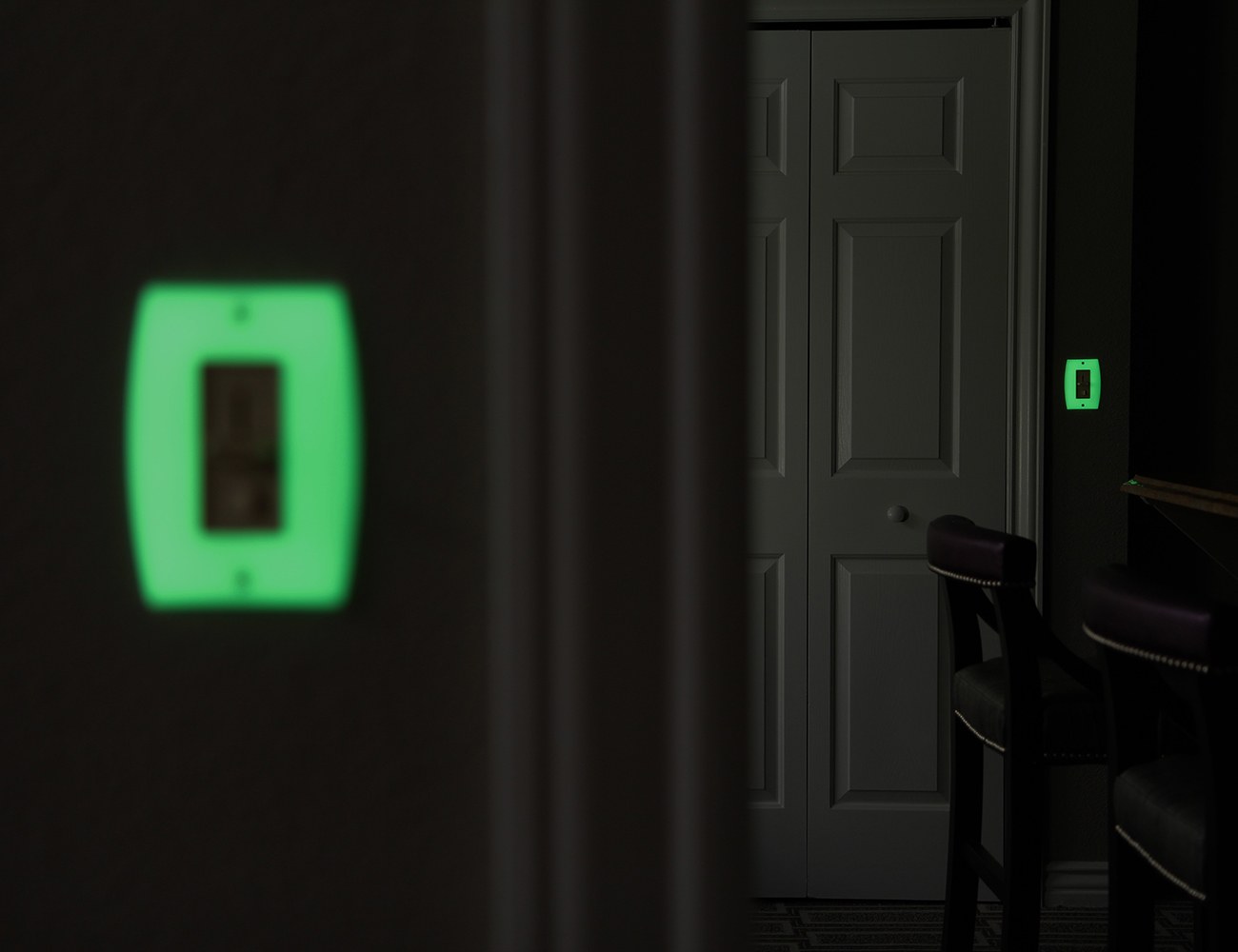 LUMINNO GlowaSwitch is a patented light switch plate made of state-of-the-art, long-persistence photoluminescent material that charges in light to GLOW ALL NIGHT LONG and help you easily find light switches in the dark.