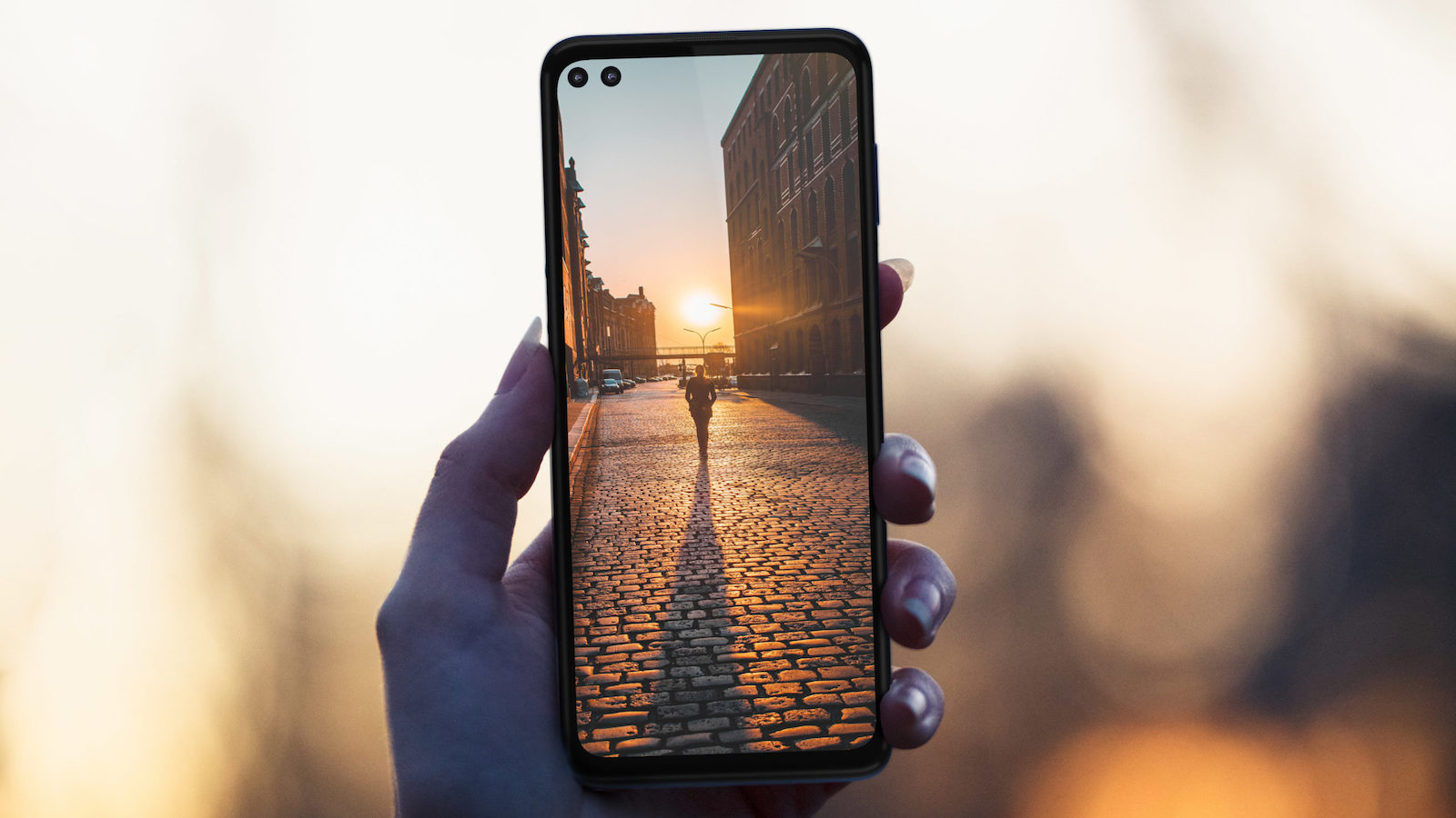 The front of the phone features double hole-punch cutouts within the screen to accommodate this extra feature.