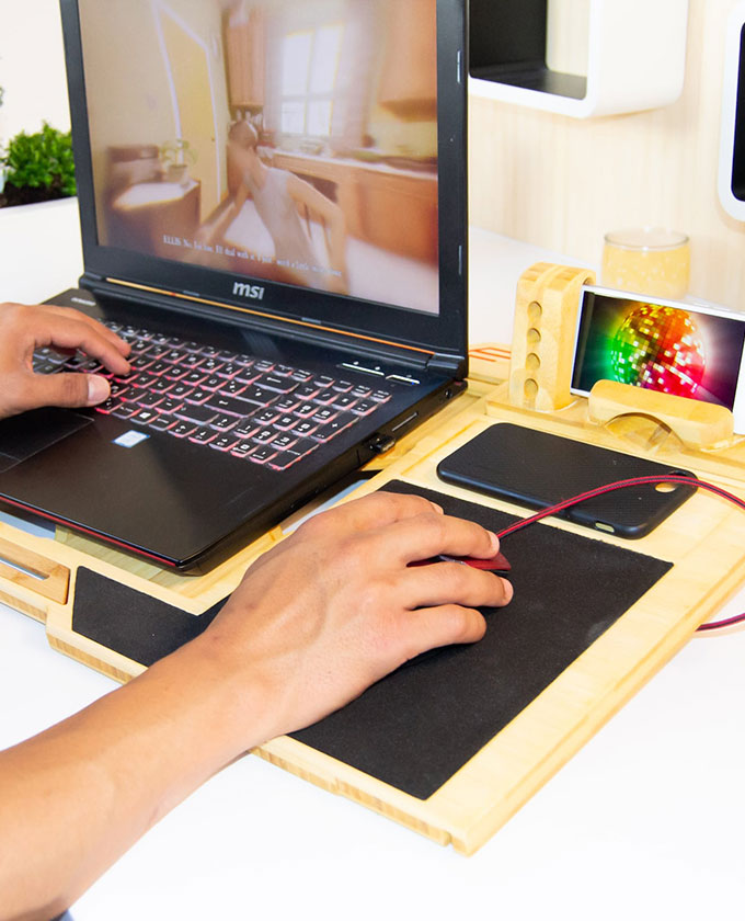 Designed to sit on your lap, the X LapDesk has a superbly comfortable cushion base. Aside from that, it’s unlike any other lap desk. It sports a built-in mouse pad, fast charger, plug-and-play USB hub, and an ambient light.