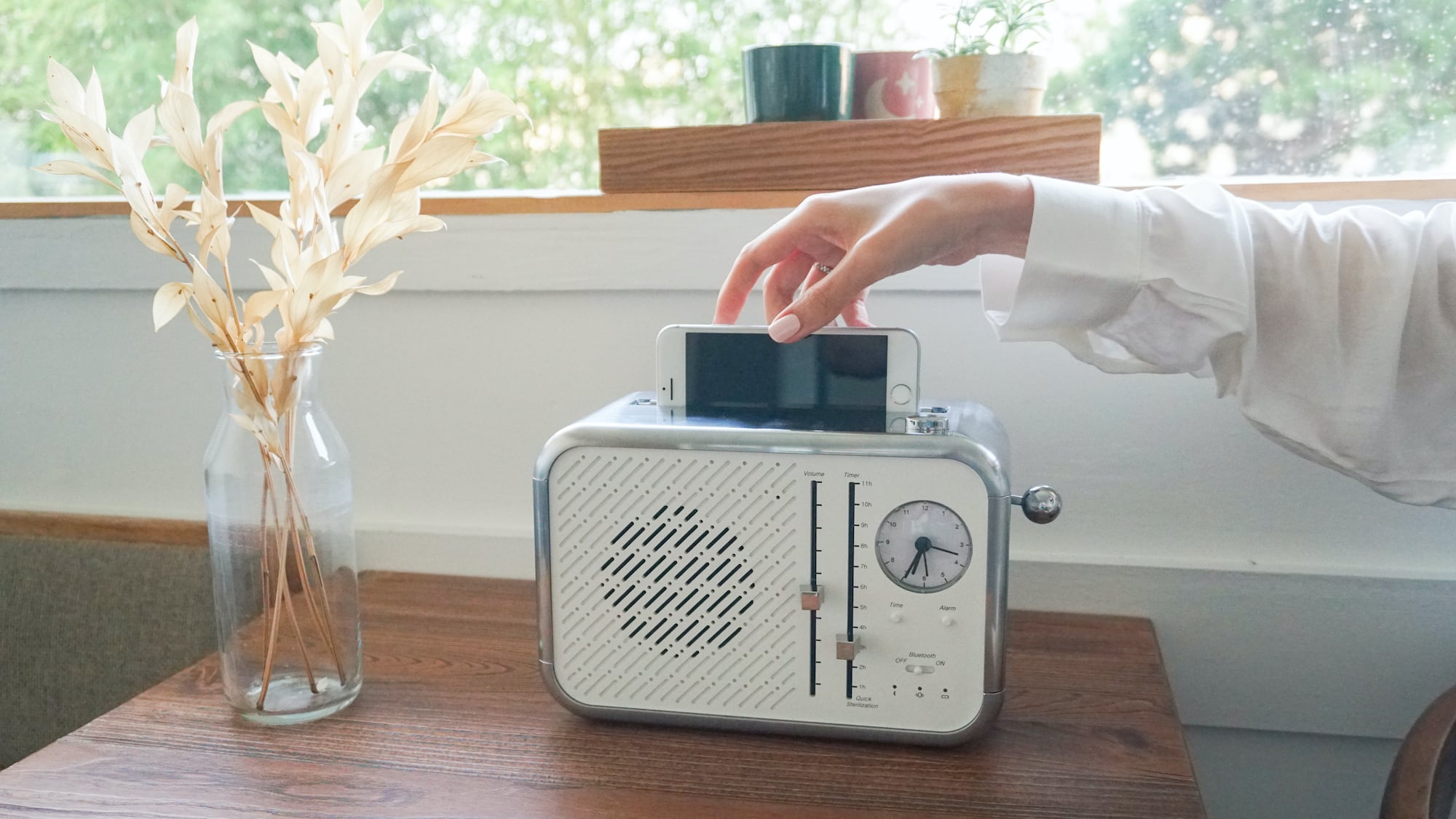 In addition to a phone cleaner, it’s also a wireless charger, an external charging port, a Bluetooth speaker, and an alarm clock.