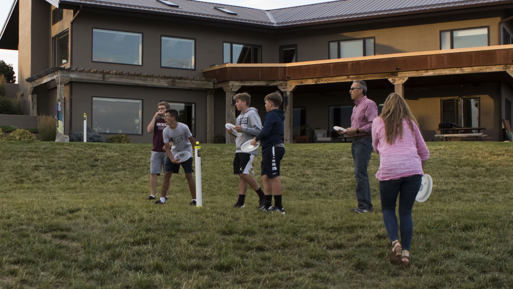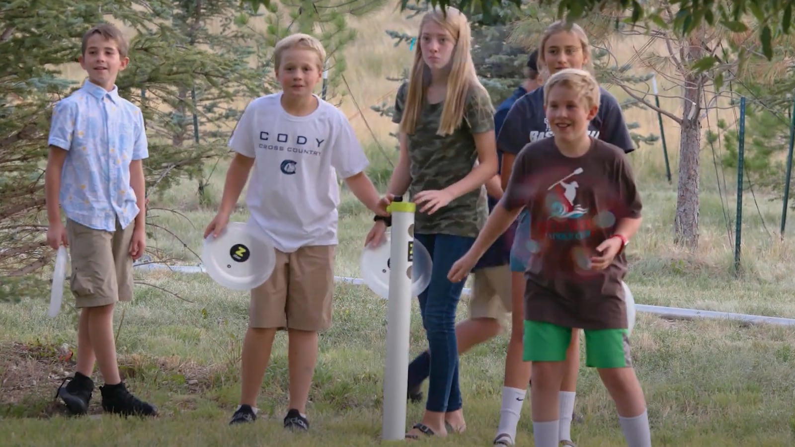 A three-dimensional game that incorporates the entire play area, this setup includes five target poles and six numbered discs.