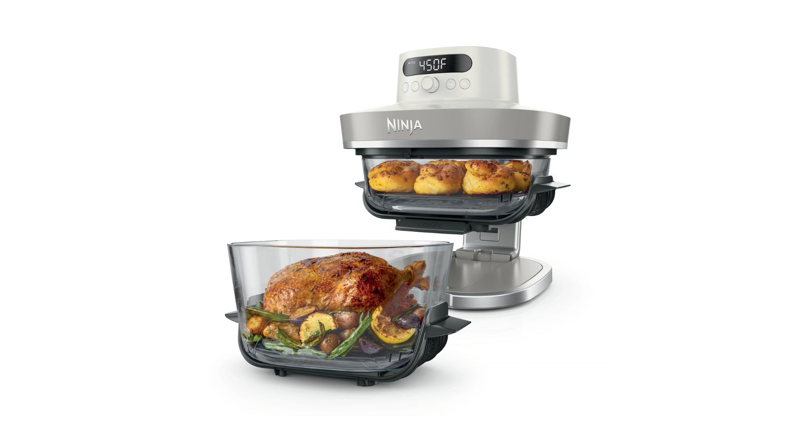 Meet the Ninja Crispi Pro, a 6-in-1 dual glass air fryer. It cooks main dishes and sides simultaneously with clear, non-toxic bowls.