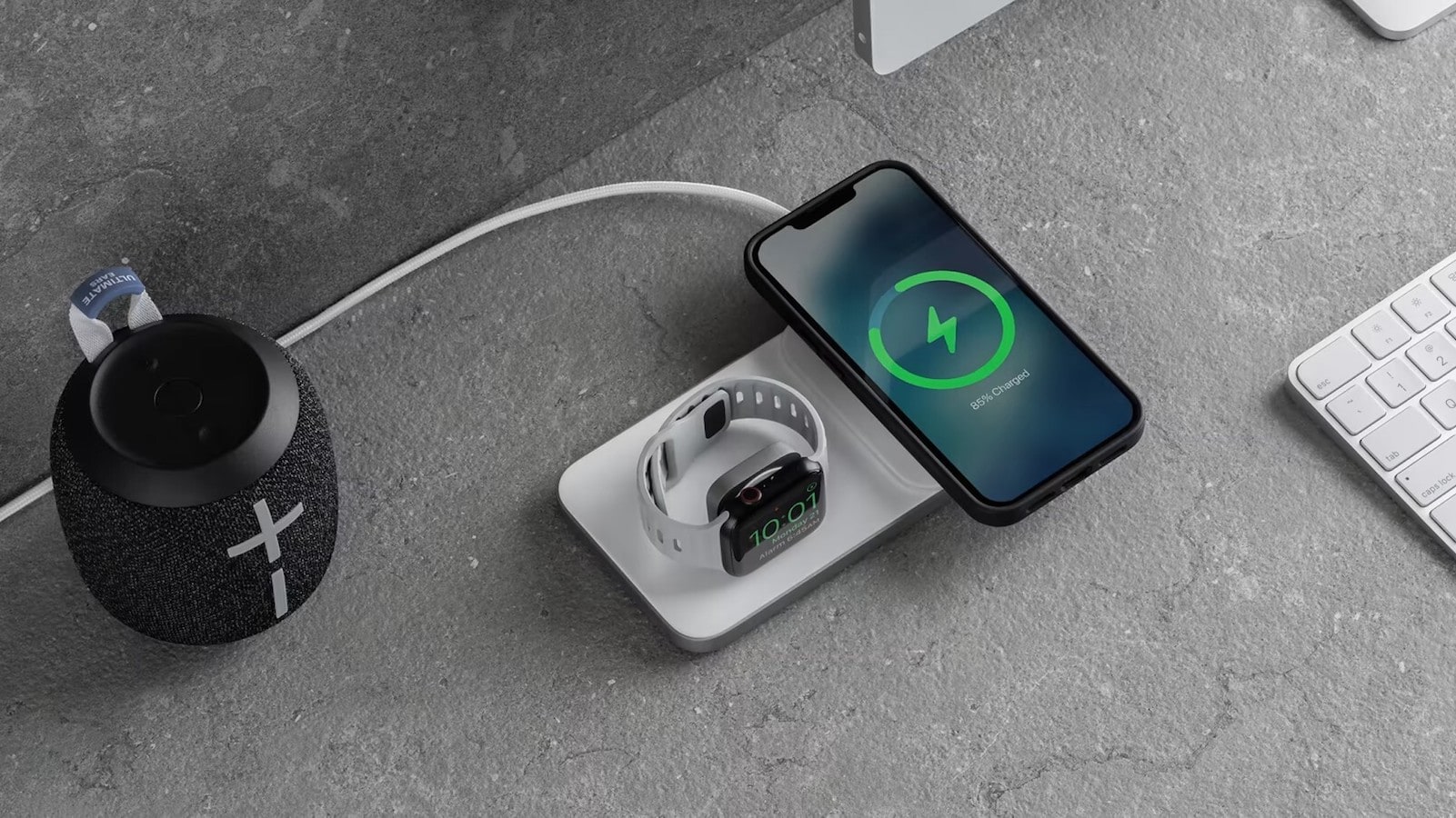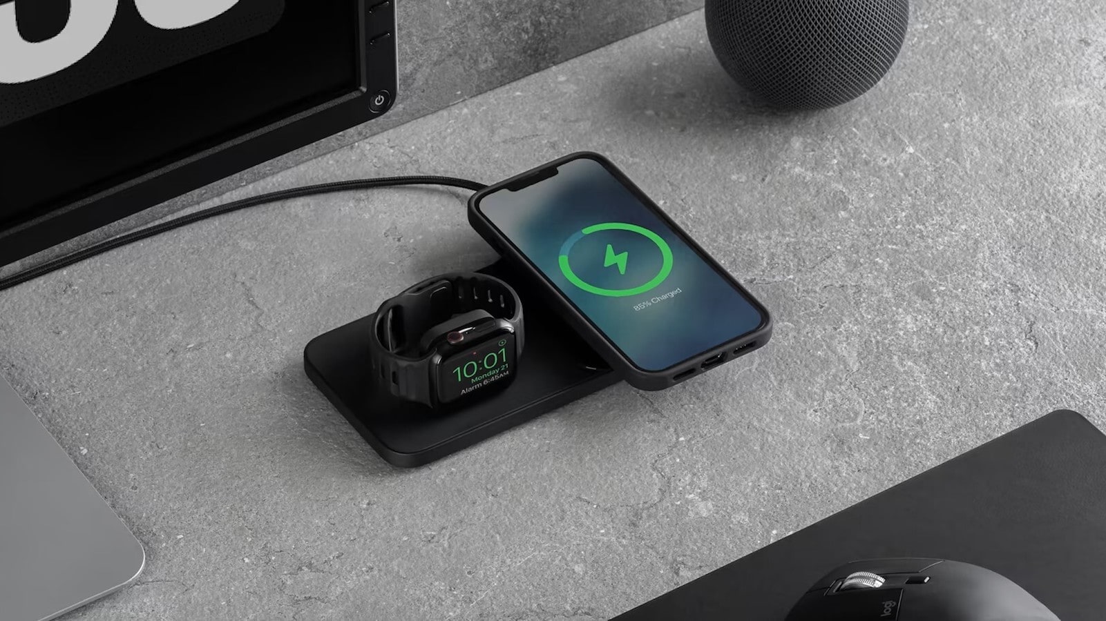 In fact, the integrated Apple Watch charger features a protective soft base. So you can use it in Nightstand mode to quickly tell the time at your bedside or work desk.
