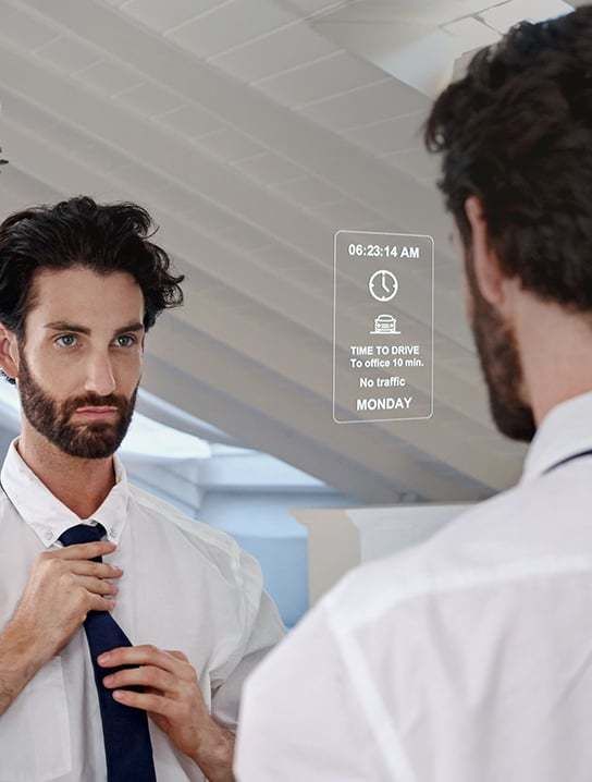 Start your day connected with MirroCool, Personal Assistant and Smart Mirror, All-In-One. Our smart mirror gets to know the real you, catering to your exact productivity needs. It uses facial gesture recognition (FGR) technology and a built-in HD camera to instantly detect you when you stand in front of it – hands and voice-free for total automation. For example, you can also use gestures to control the mirror. A simple wink will activate the camera for the perfect selfie.