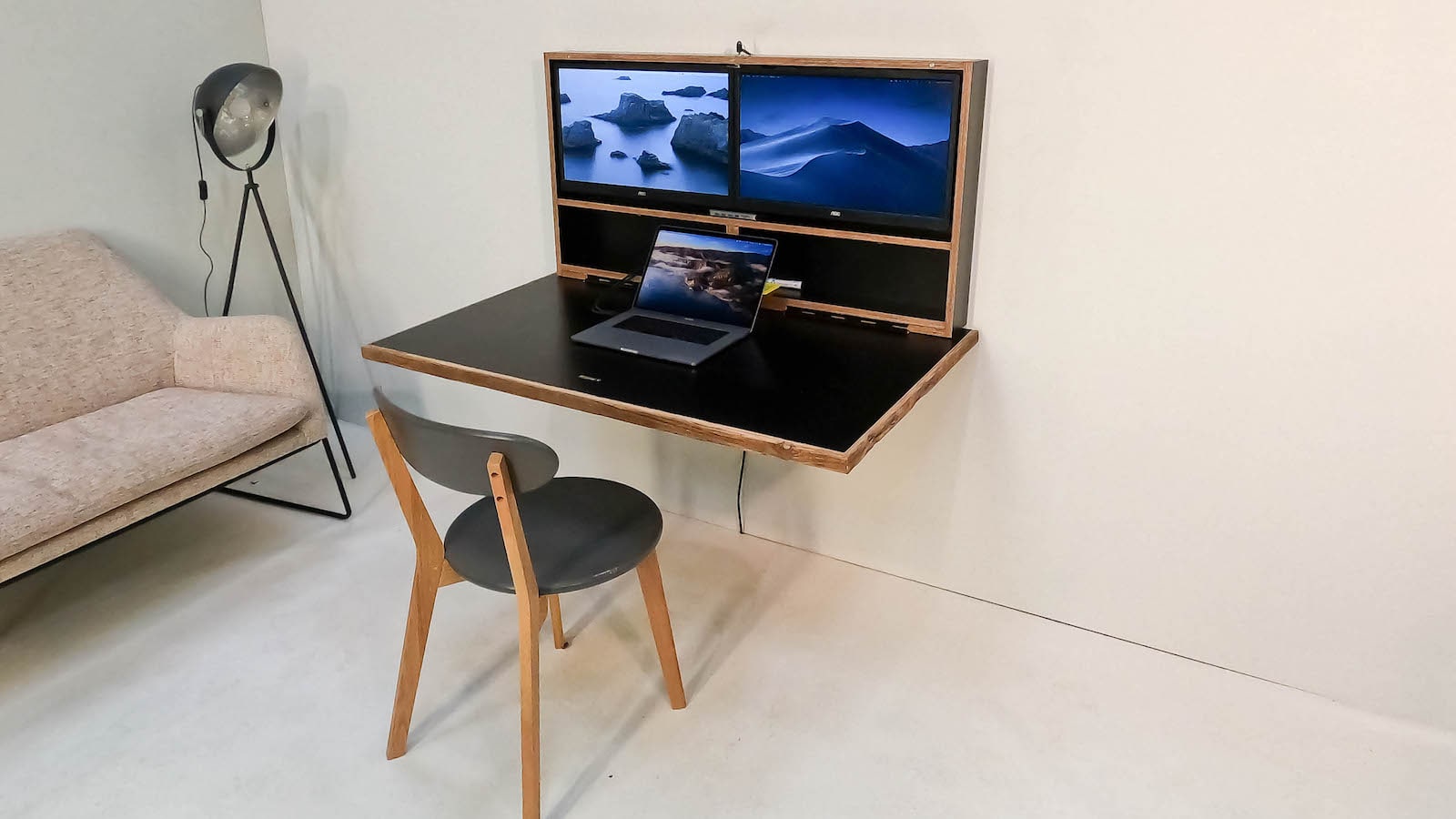 This wall-mounted foldable workstation features charging compatibility suitable for both PCs and Macs.