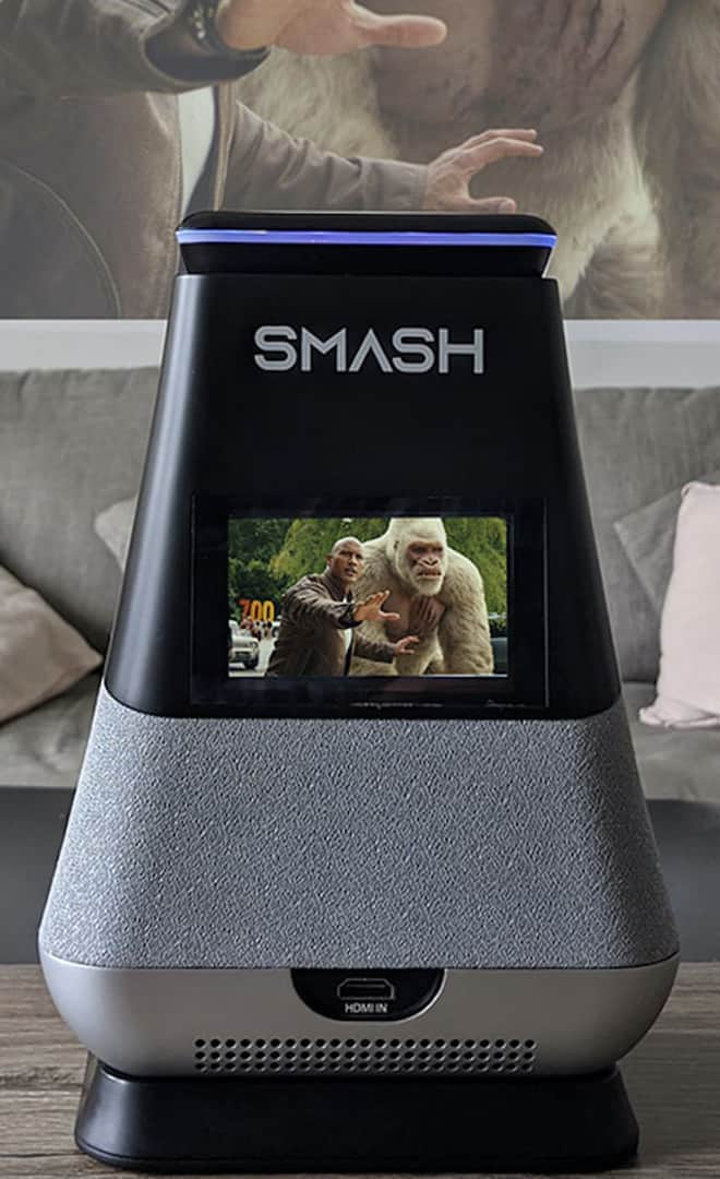 The WooBloo SMASH portable smart projector has built-in far-field Alexa for easy voice assistance and delivers 300 ANSI lumens of brightness.