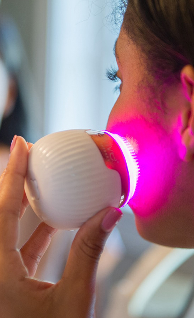 Acne-fighting blue light therapy destroys acne-causing bacteria and reduces redness and inflammation.