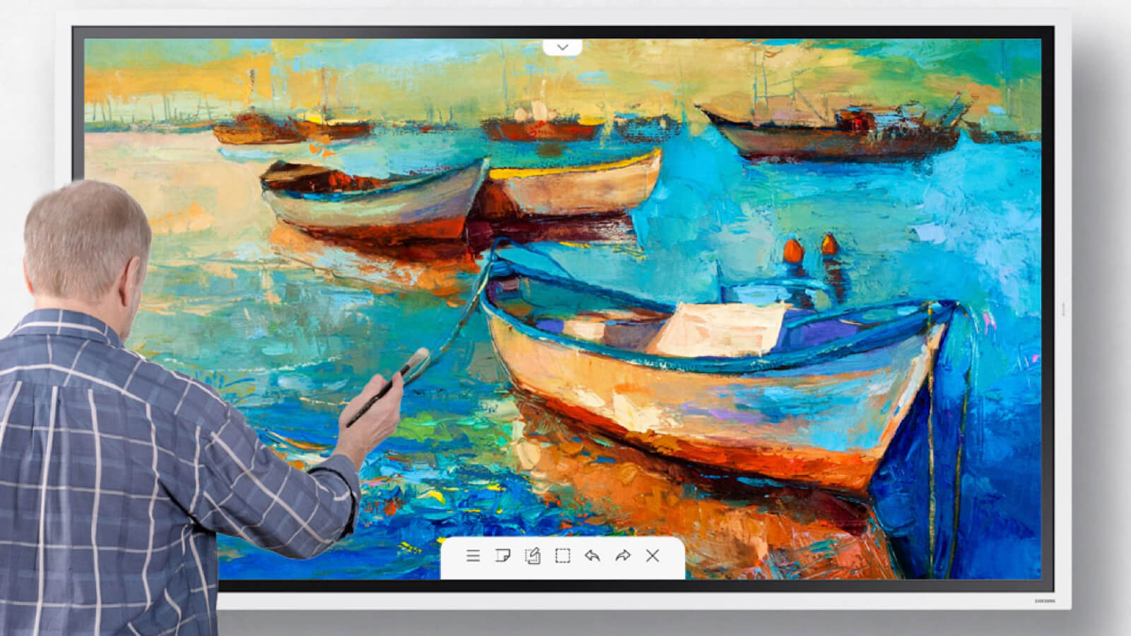 Moreover, it’s available in two sizes: 55″ and 65″. Therefore, you can use the Samsung Flip 2 Display 2021 in small conference spaces and classrooms. Or opt for a wall-mounted design that’s best suited for large conference rooms or lecture halls. Either way, both models provide a smooth and paper-like material. This makes it ideal for drawing or jotting notes. And up to four people can write simultaneously, making it great for teamwork. Simply erase your creations with a finger or palm swipe