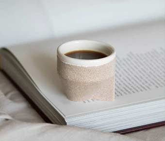 Omitting a traditional handle, the ceramic and sand infused cups come with a triangular gripping area.