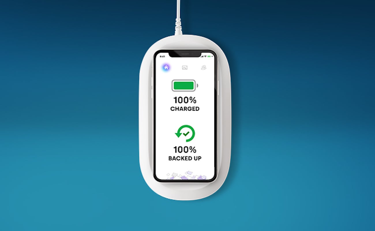 When you place your smartphone on this wireless charging pad, it will automatically charge and back up at the same time.