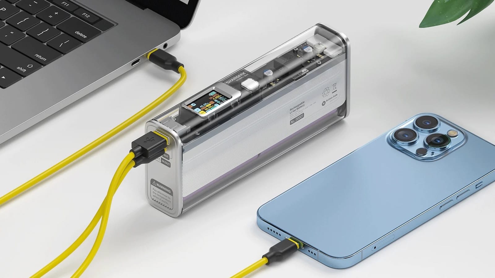 Keep charging your everyday gadgets in style with the Shargeek Storm² Slim 130w power bank. This power bank displays its sophisticated internal layout with a transparent design.