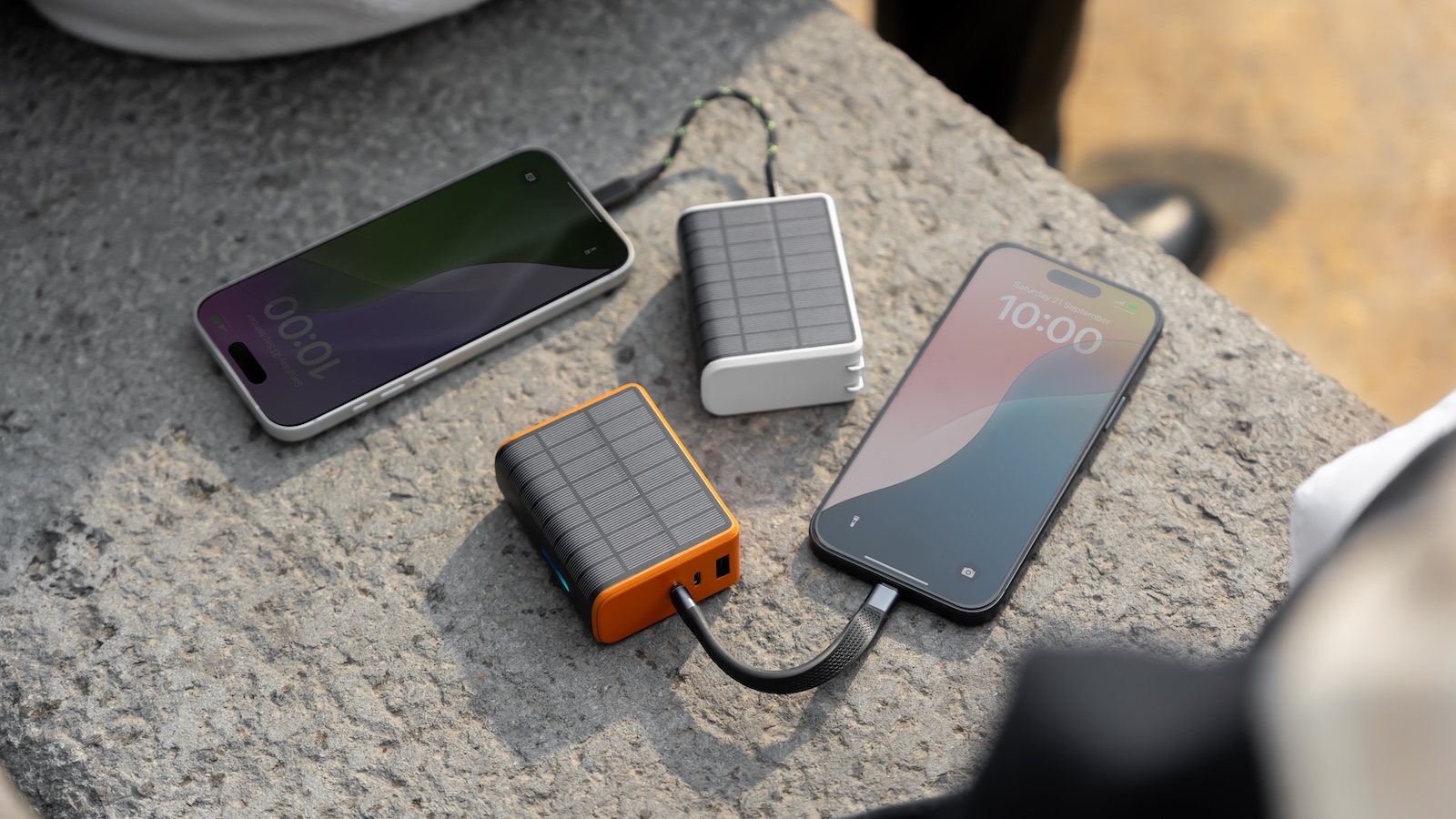 Solly is a 20,000mAh solar power bank that combines high-wattage fast charging, a built-in wall charger, and travel adapter support into one compact device.