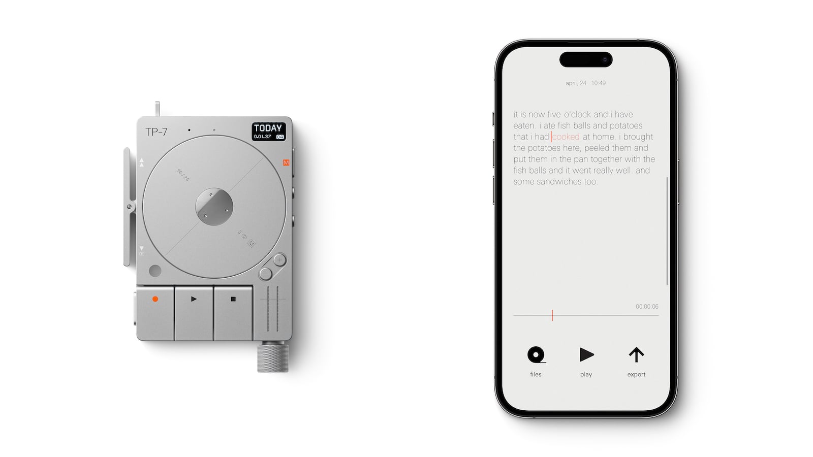 Make recordings easier with the teenage engineering TP-7 field recorder. It records sound, interviews, music, and your best ideas with zero friction in premium quality.-Fits in your palm for 1-handed operation. Your index finger controls the fast forward while the middle finger rewinds. The thumb records, and the pinky selects the mode.-A motorized tape reel with ball bearings in the center and a sensitive hall sensor helps you visualize your recording.-A side-mounted rocker lets you scrub through your audio.-It turns audio into text. Just connect your phone to the TP-7 via Bluetooth or USB.-An ‘off-the-record’ button lets you quickly pause the recording.-The zero friction design removes the steps from the typical smartphone recording process.-Has 3 stereo 2-way jacks for use as either inputs or outputs.-Offers a 7-hour battery life.-Comes with an internal mic and speaker