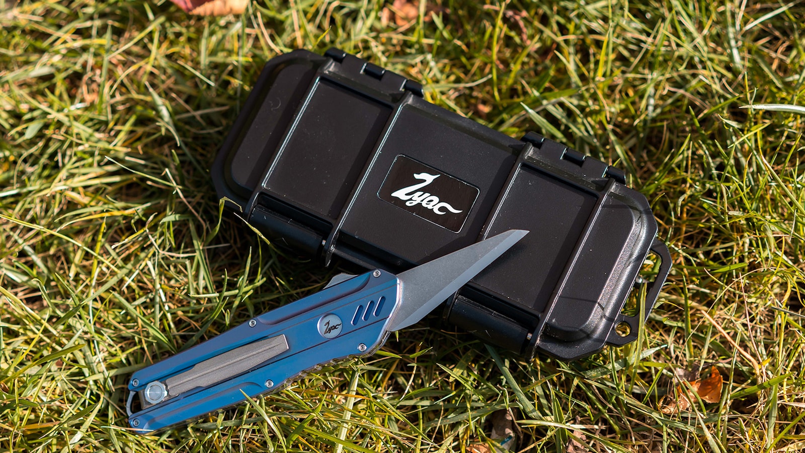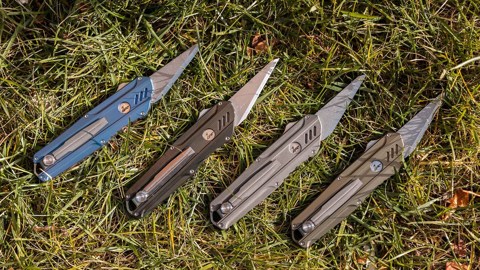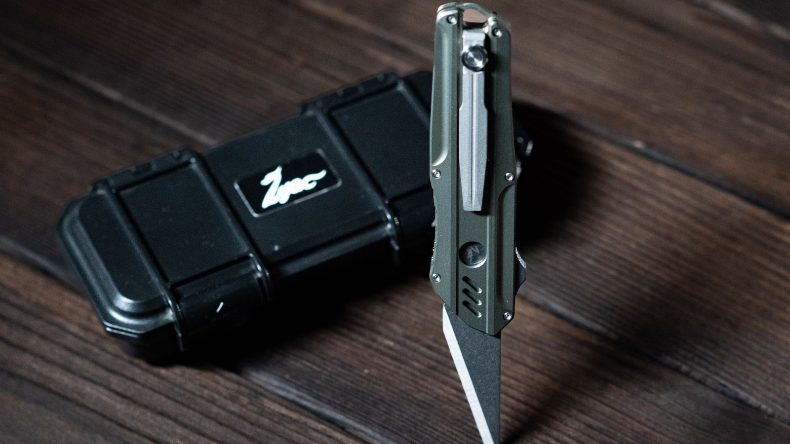 With a replaceable blade design, it consists of an OTF automatic knife designed for an OLFA CKB-2 utility blade, which you can find everywhere.