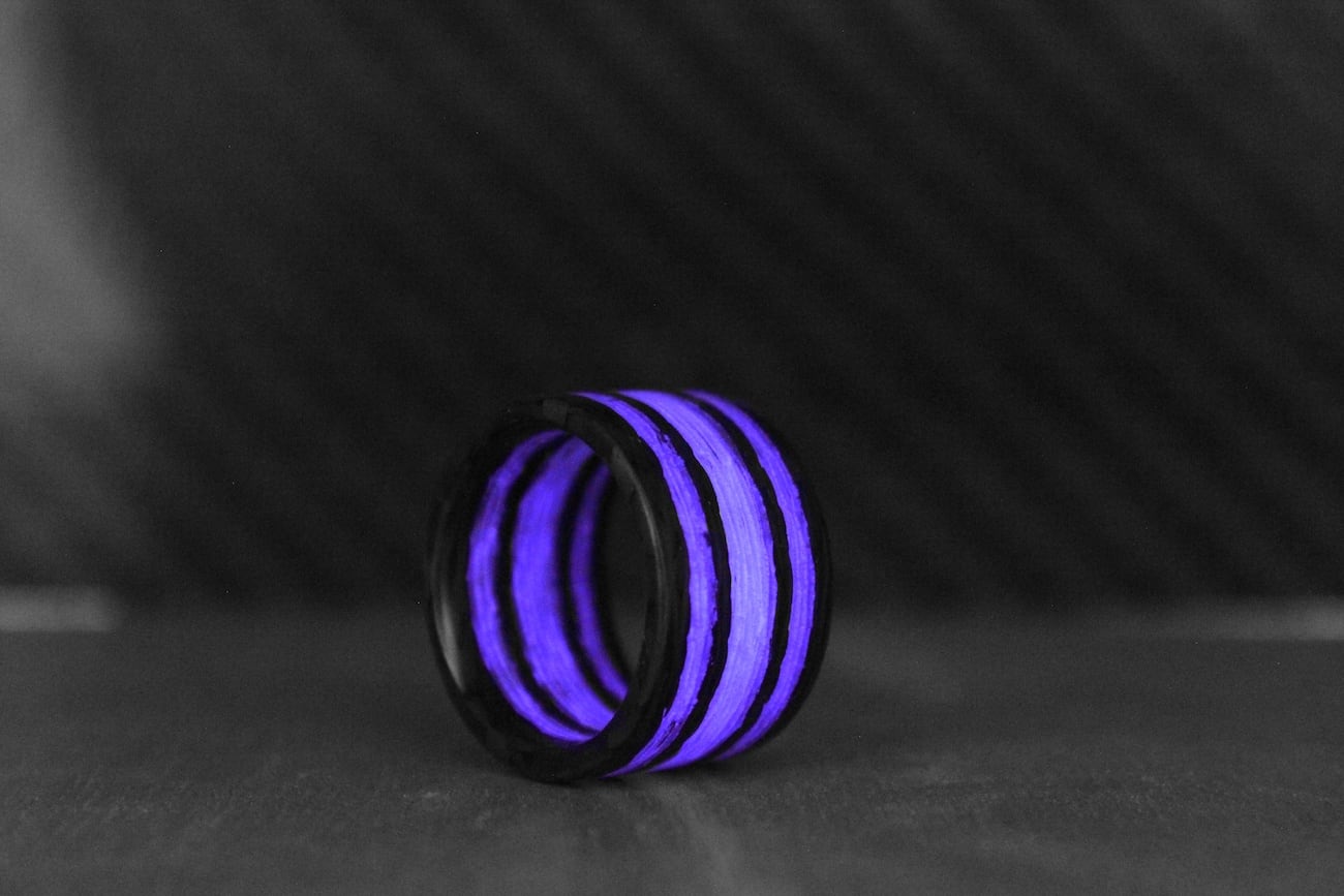 You “charge” the rings using direct sunlight, a bright LED, or even a UV or black light. After just 30 seconds in the sun, your ring will glow. In addition, the Triton Rings glow brighter and longer in a darker room. At their brightest, the Triton Rings glows a beautifully vibrant green. Blue is slightly less bright, followed by purple then red. However, the red is truly stunning as it produces an orange fiery glow. The Triton Rings are handmade and customizable in width, size and color. They use highly versatile carbon fiber because it’s hypoallergenic and superbly durable yet also lightweight. Plus, it helps the inner material glow its best and create glow stripes