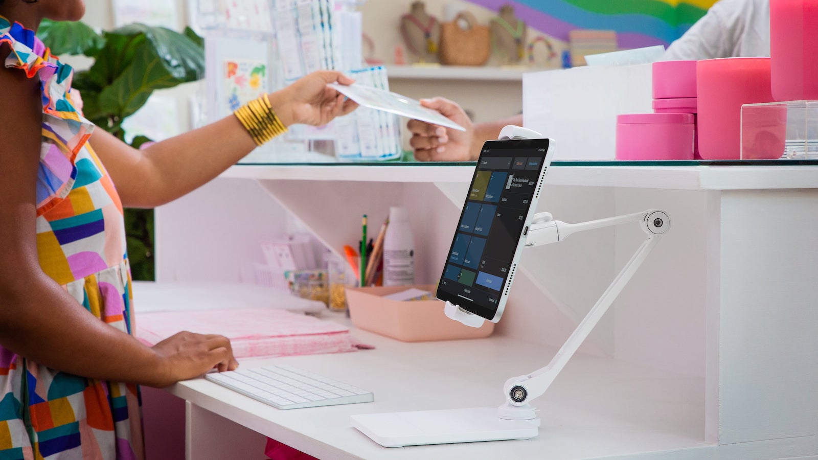 It comes in 2 colors—black or matte white—to match your desk or workspace. In fact, this arm lets you use your iPad or iPhone in infinite positions, heights, and angles. Additionally, the new QuickSwitch tab allows you to switch between Desktop Base and Adjustable Clamp in seconds.