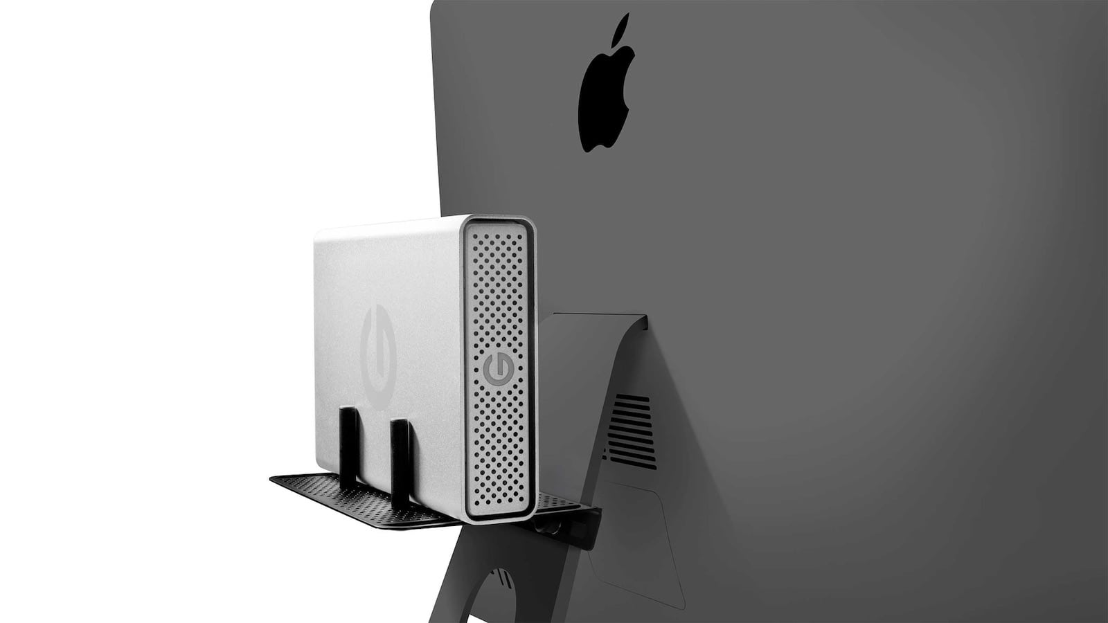 Which means you don’t love all the cords and untidiness your necessary peripherals create. And that’s where the Twelve South BackPack iMac storage shelf comes in. This sturdy, sleek shelf comes in Silver and Black colors to blend with any iMac. In fact, attaches to the L-shaped stand of any iMacs or Apple display, sitting discreetly behind the screen. And you can even fit up to three of these super-thin shelving units behind your computer.