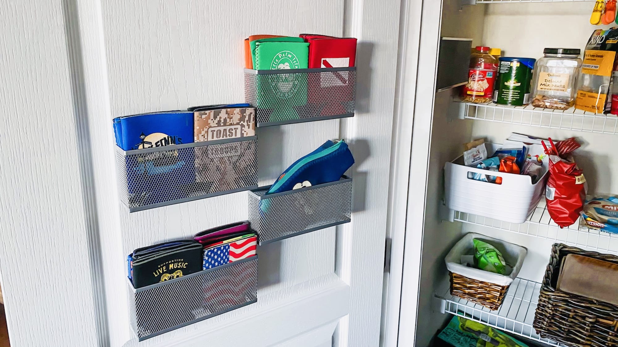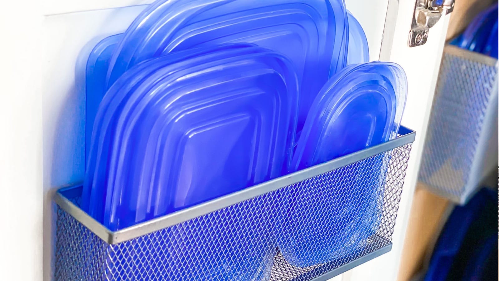 Put it on a kitchen cabinet for little things like spice jars, kids utensils, and storage container lids.