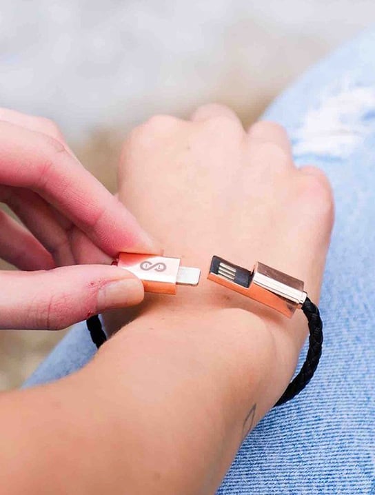 The braided cable bracelet charges and syncs your devices at fast speeds and comes in three options: USB-C, micro USB, and lightning.