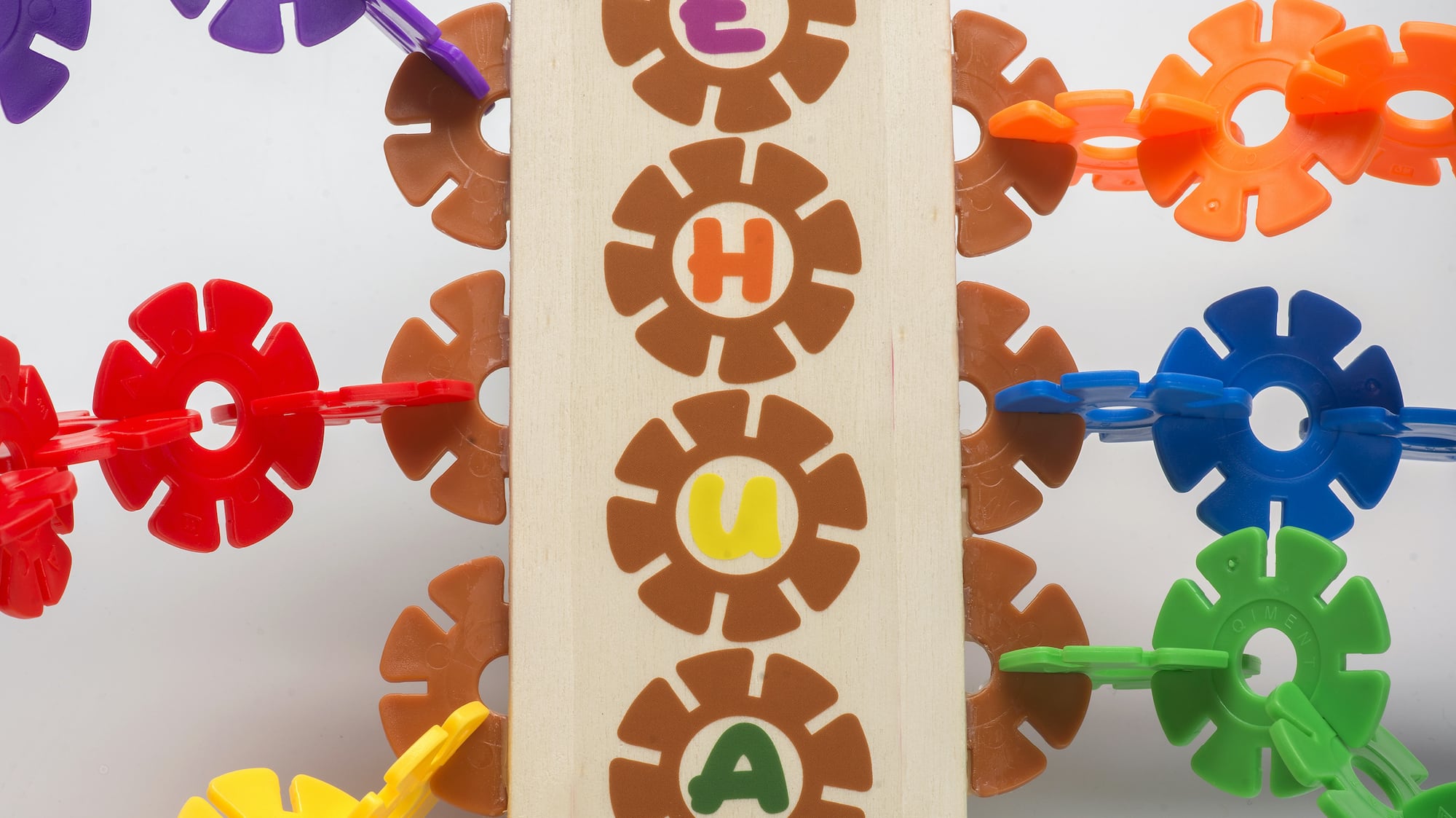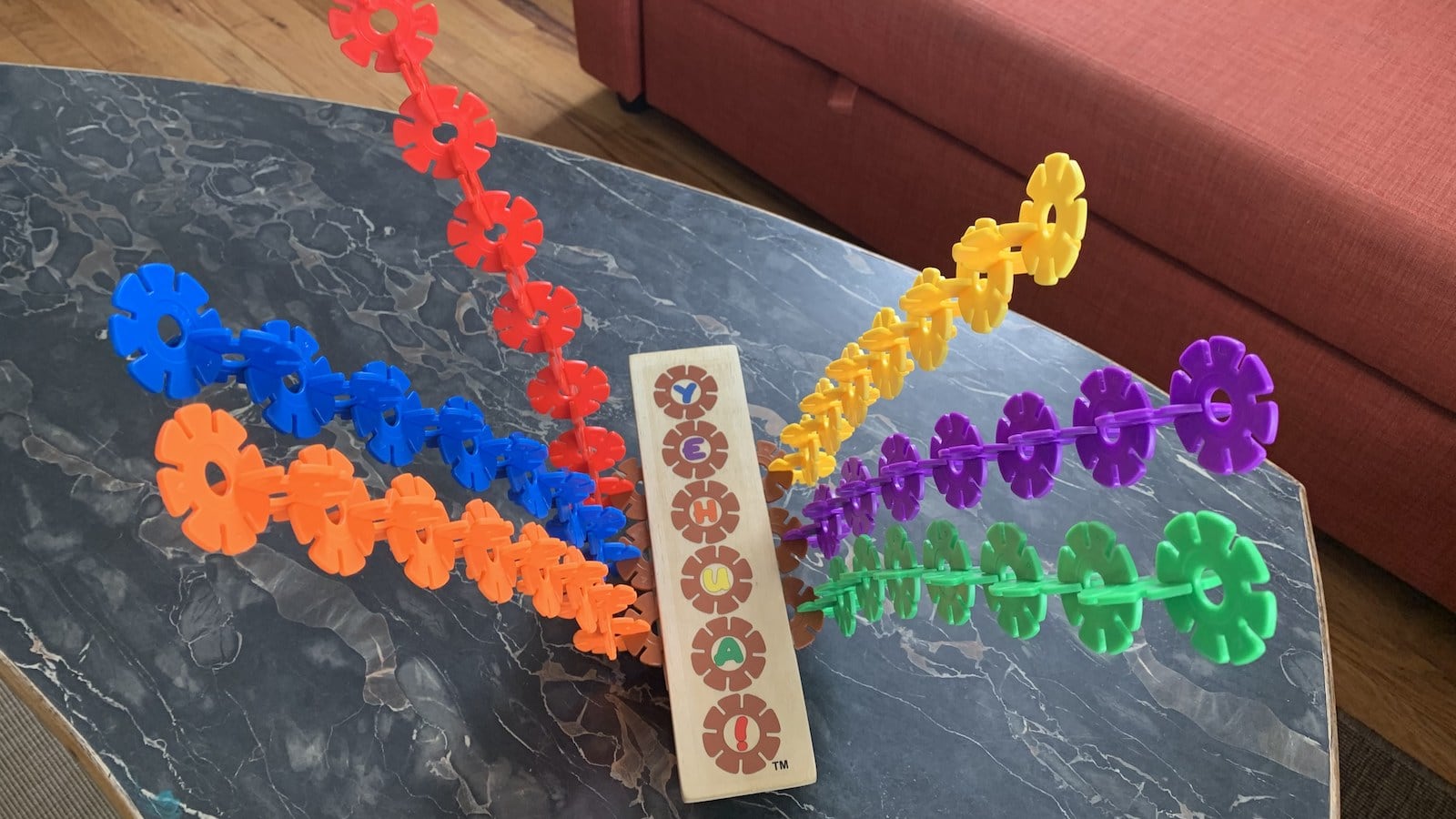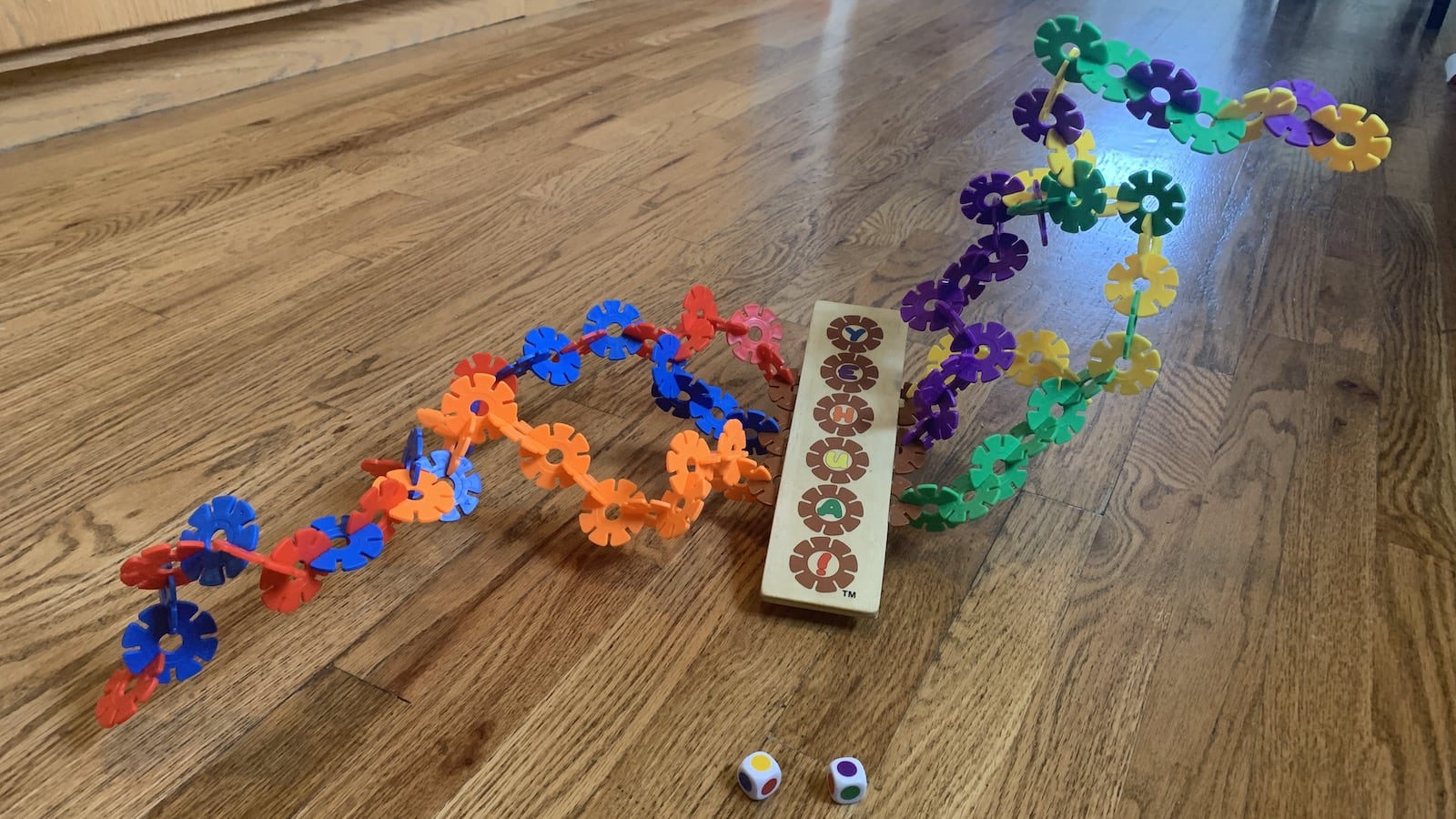 You’ll take turns stacking the wildflower pieces atop the rocker board while connecting them to the side vines.