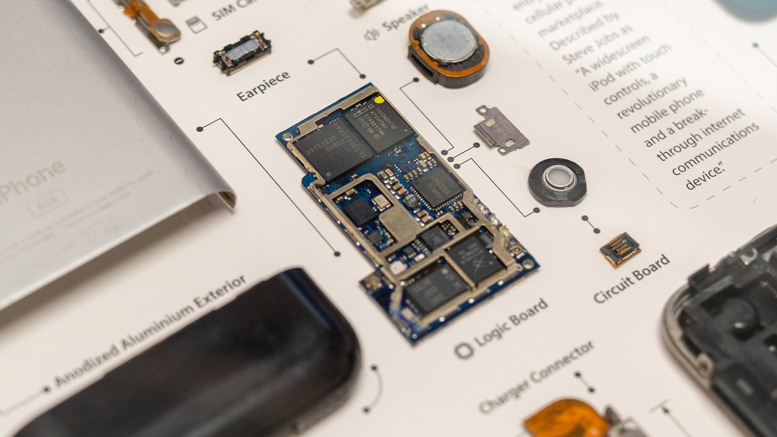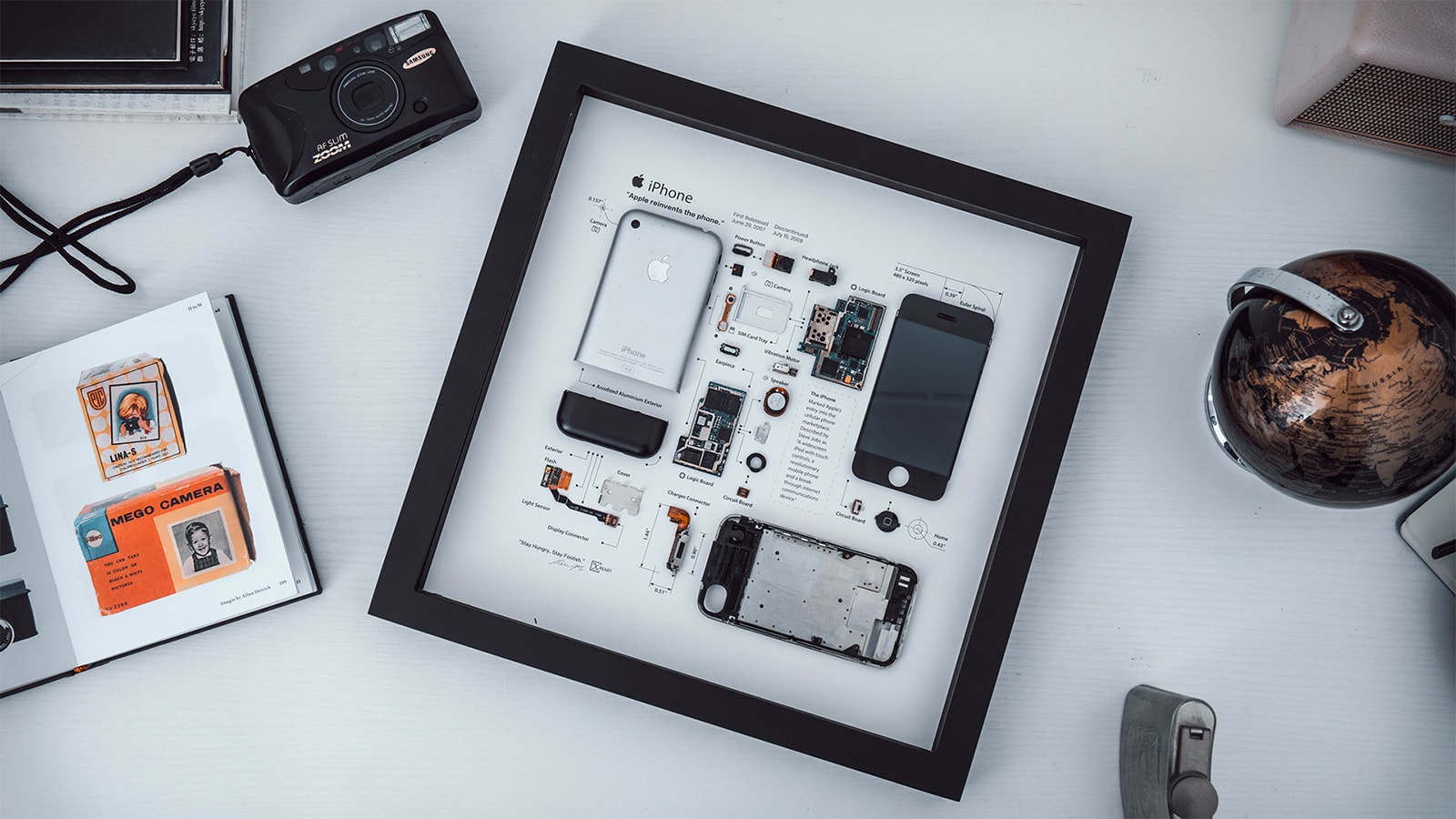 Measuring 13 inches square, the frame houses a nearly 12-inch-square display paper with a teardown of the 1st-gen iPhone.